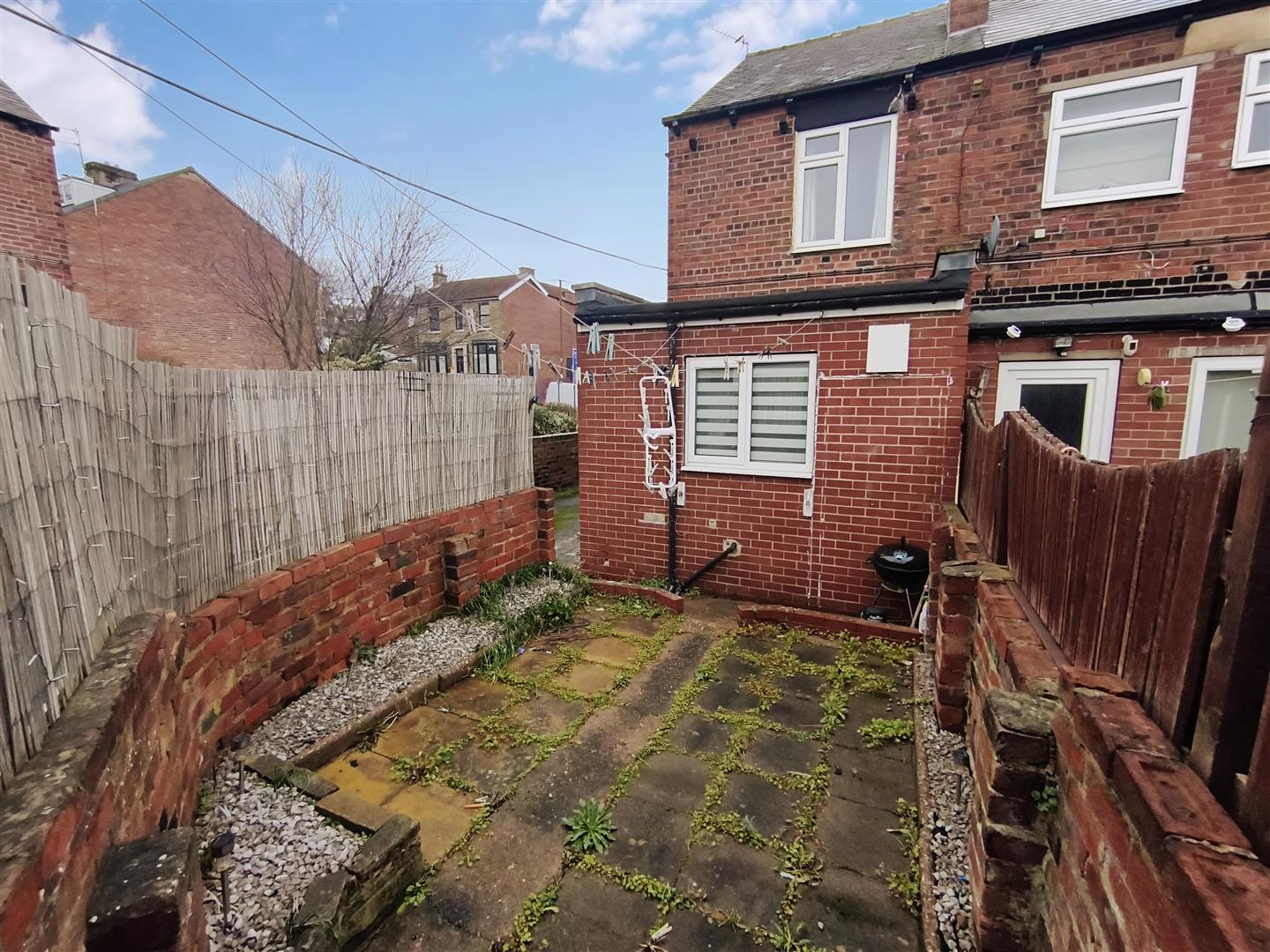 To the front is a patio enclosed by brick wall with the larger rear patio also enclosed by brick wall. In addition to the external space, there is a also a garage, useful for storage as well as putting a car in, plus two storage sheds.