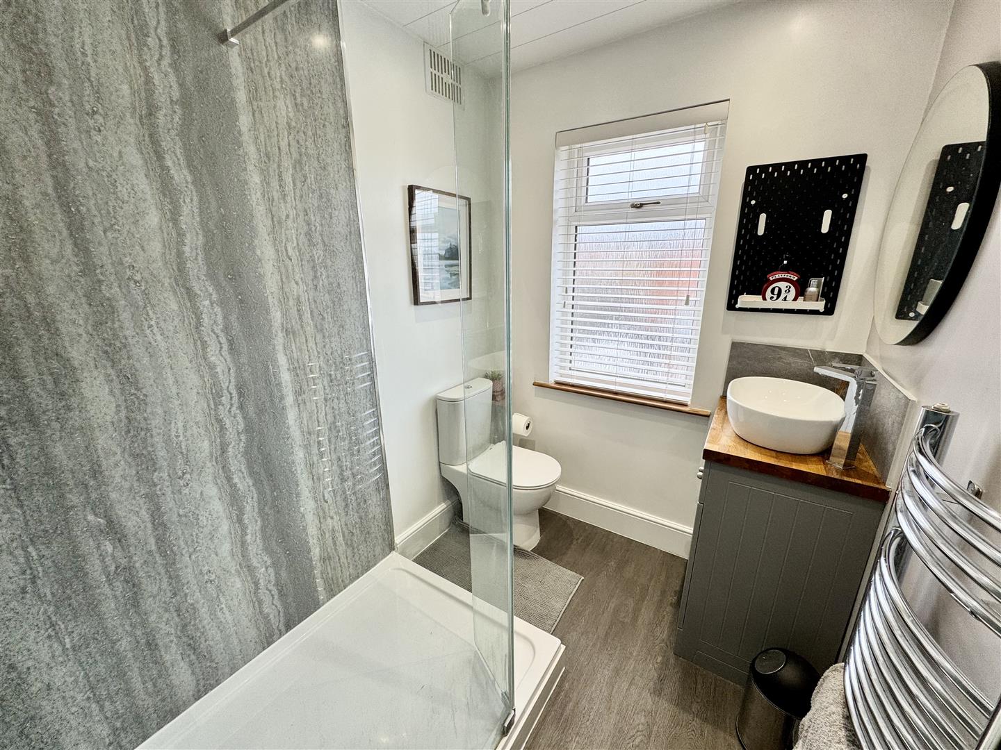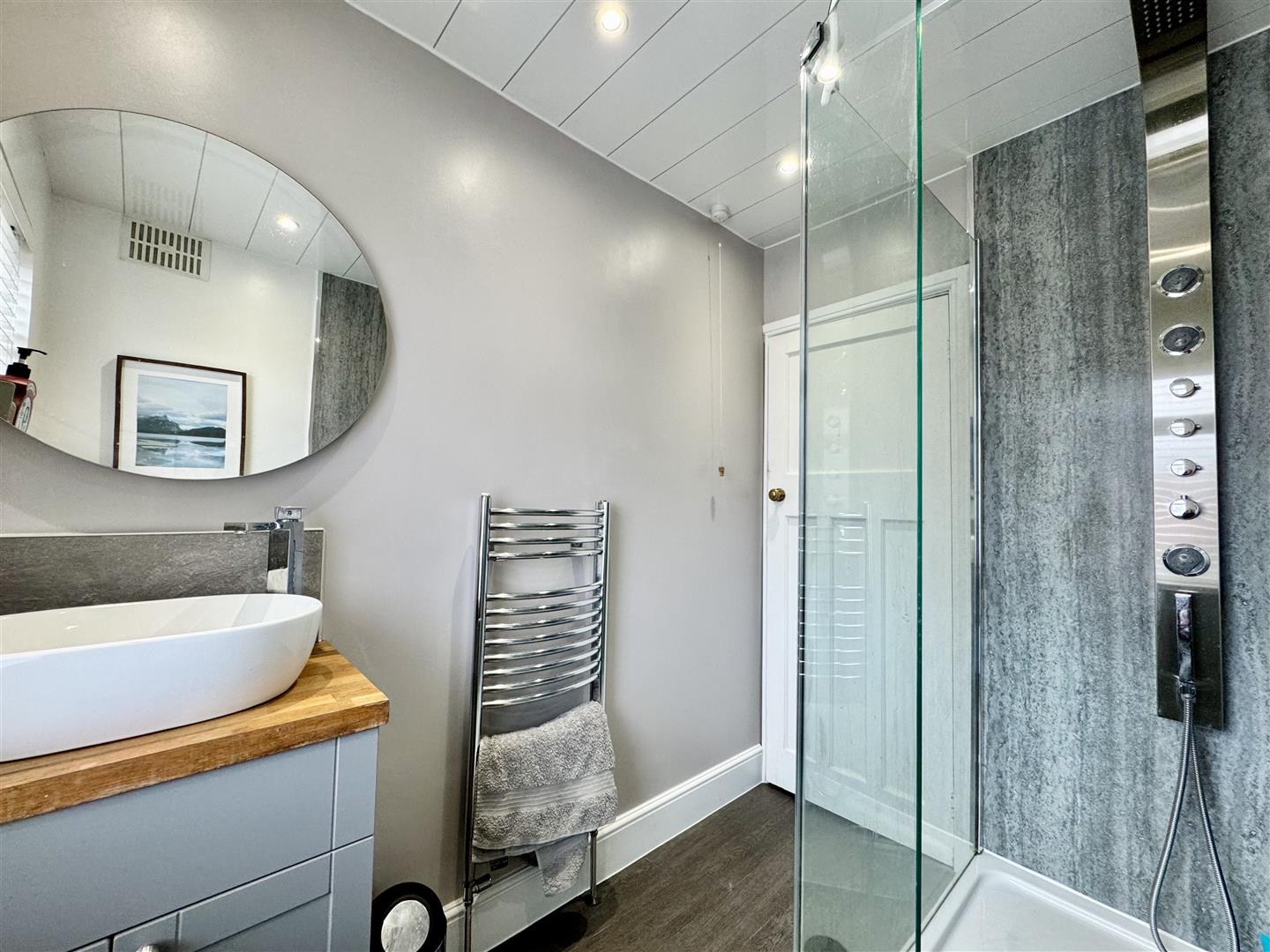 Stylish shower room having a three piece suite in white consisting of a double shower area with multiple massage jets shower tower, rain shower overhead and glass screen, vanity wash unit with an oval basin, mixer tap and storage under and a twin flush low level WC. There is a chrome ladder towel radiator, tiling to splash areas plus low maintenance panelling in the shower, laminate flooring and a low maintenance ceiling with inset spotlights. A double glazed window with obscure glass brings in natural light and an internal door leads to the landing.