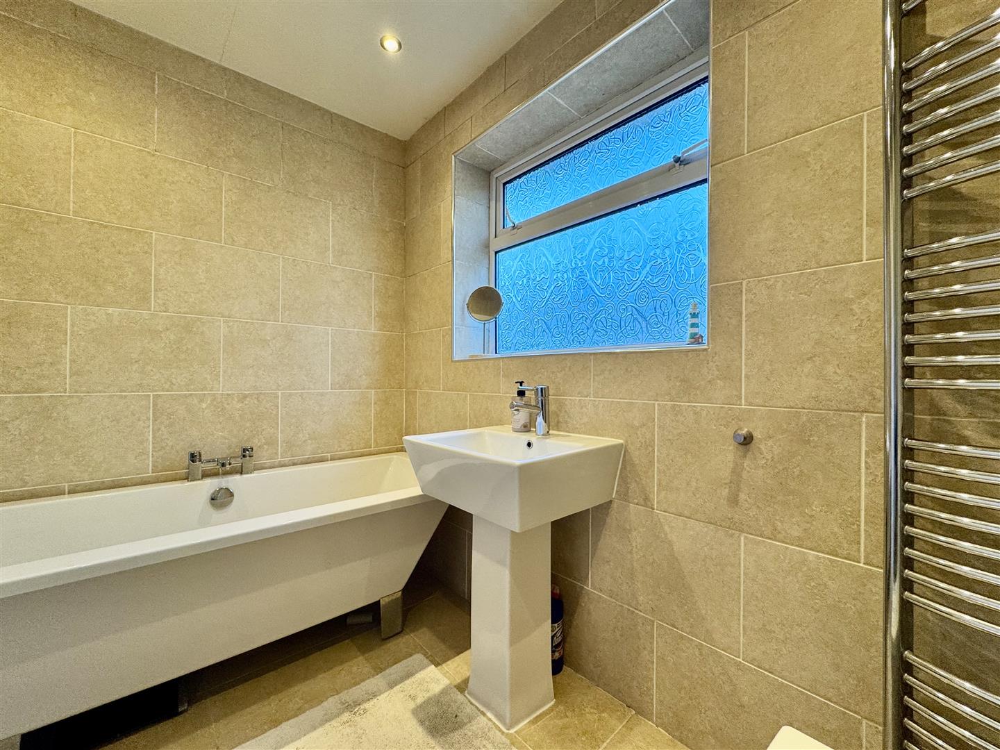 This attractive bathroom is fitted with a four-piece suite, including a freestanding bath, corner shower with sliding glass screen, pedestal hand wash basin with mixer tap, low level W.C and a chrome towel radiator. The room is fully tiled with complimentary tile underfoot and spotlighting to the ceiling. A rear obscure window allows light to flow through and a door leads to the landing.