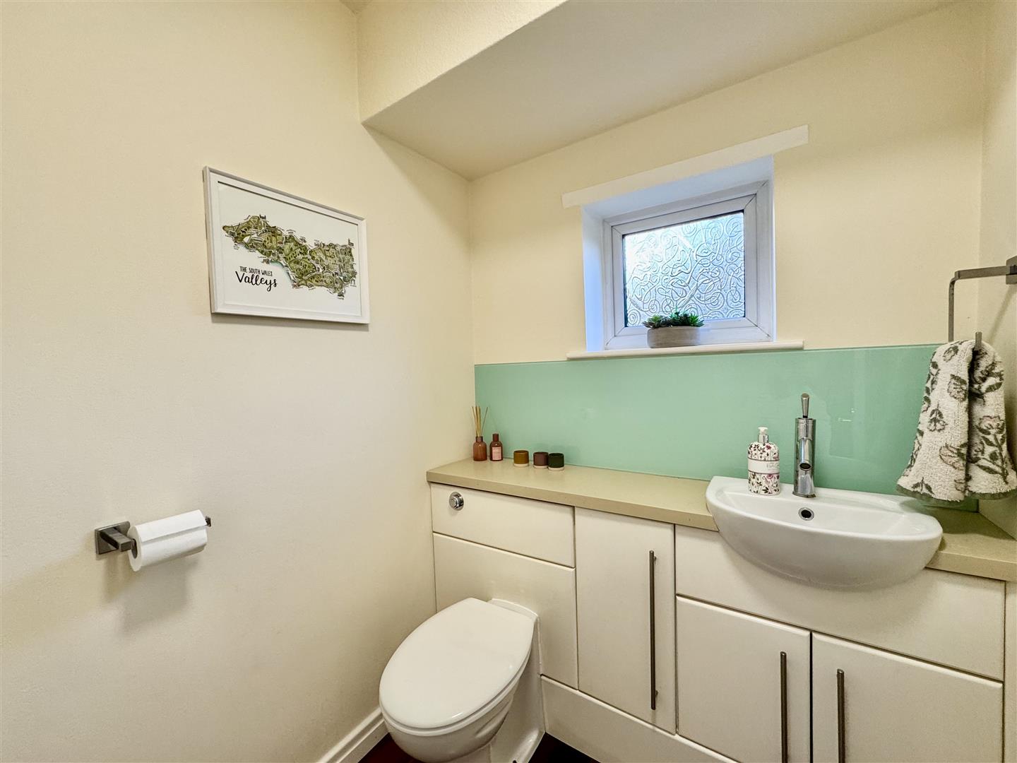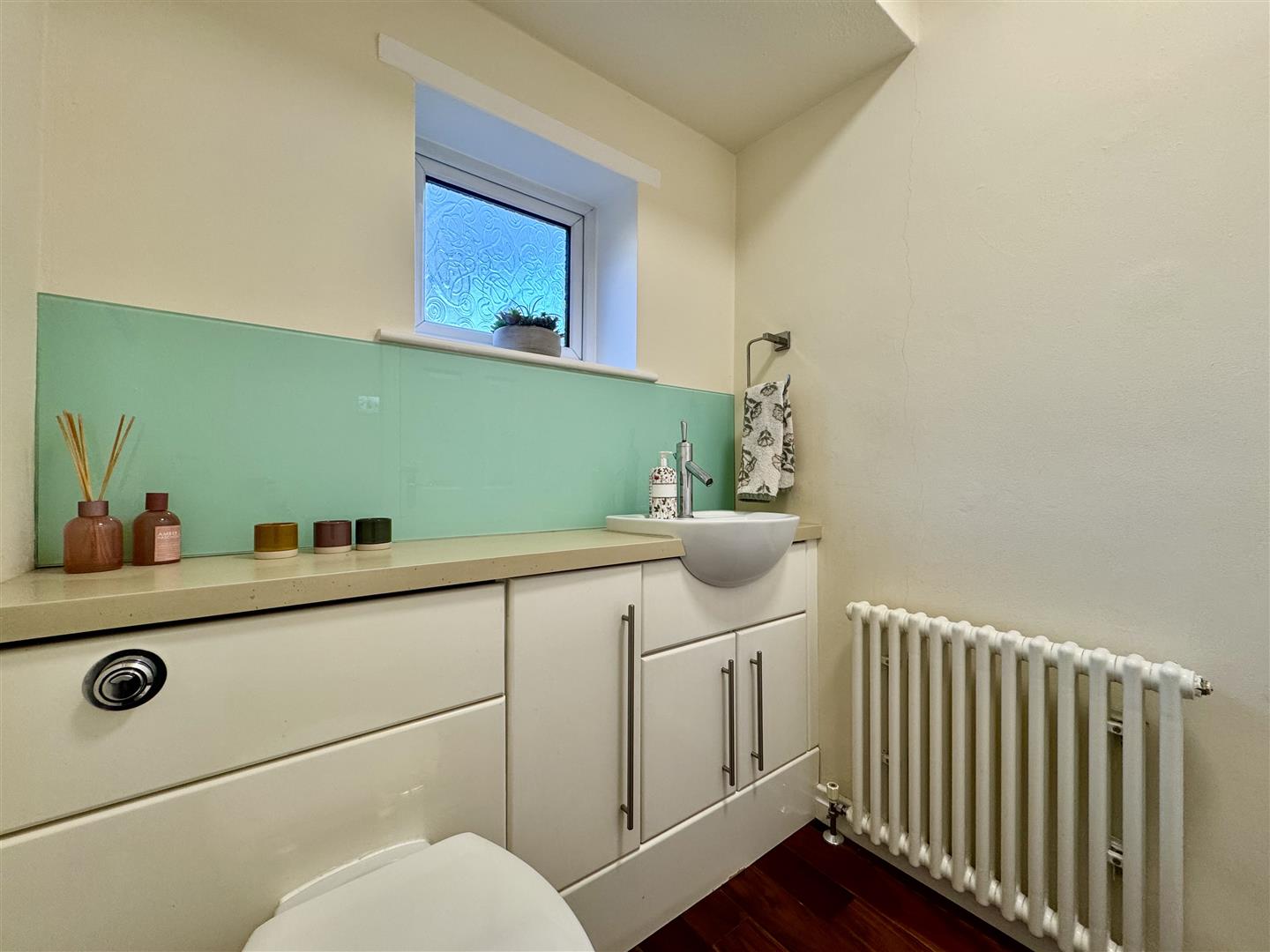 Positioned off the entrance hallway, this handy ground floor cloakroom is fitted with a hand wash basin with a mixer tap, fitted cabinetry and a low level W.C. There is walnut flooring underfoot and an obscure front window.