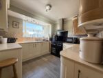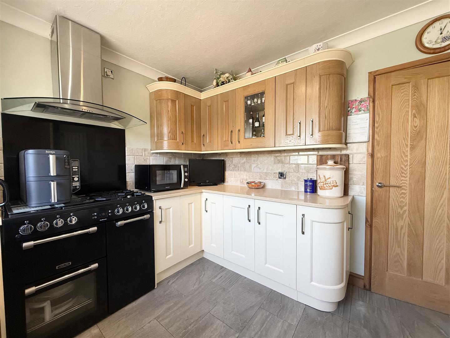 Fitted with shaker style cream and oak effect wall and base units, granite work surfaces, tiled splashbacks and a ceramic one and a half bowl sink and drainer with mixer tap, this lovely neutral kitchen also benefits from a Cookmaster range style oven, extractor fan and integrated fridge. A window looks out over the front of the property, there is tiled flooring and a door leads to the hallway.
