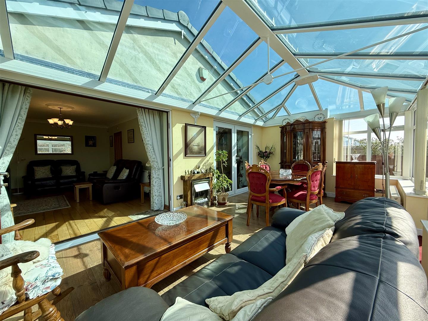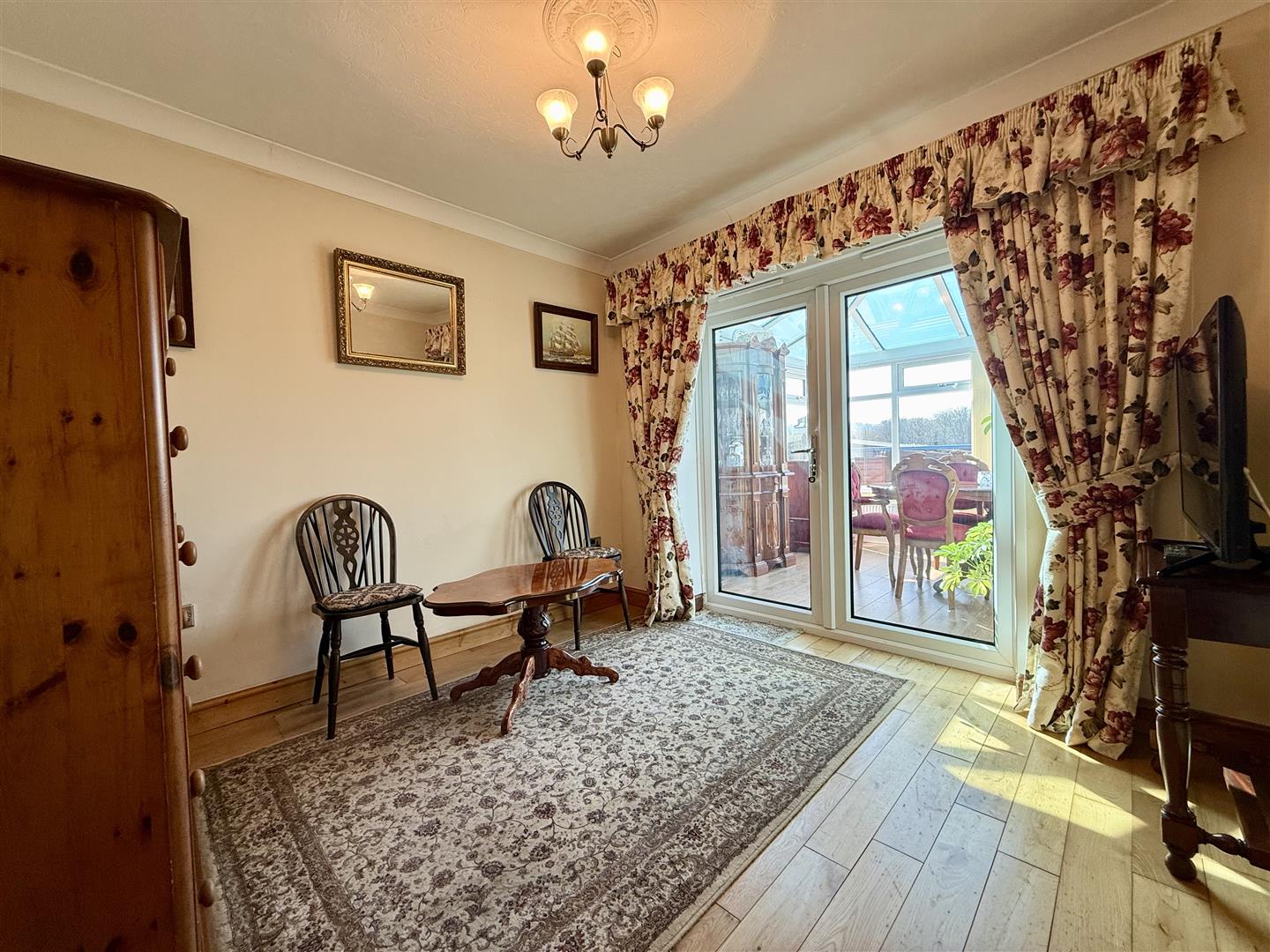 This large lounge offers ample space for a range of freestanding furniture and is tastefully decorated in soft pale tones. There is a feature brick fireplace with black tiled hearth which is currently home to a wood burning stove. The beautiful solid wood flooring continues through from the hallway, the room boasts ceiling and wall lighting alongside bi-folding doors which open fully into the conservatory providing the option to either separate the two living rooms or create an impressive open plan space.