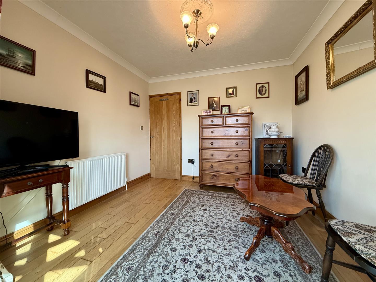 A superb addition to the property, this fantastic conservatory spans the width of the property and offers extremely versatile living accommodation. The vendors currently have a dining table and chairs alongside sitting room furniture in here and often have the bi fold doors open into the lounge, making it the perfect entertaining space. There is an electric feature fire with timber mantle over, windows to three sides overlooking the pretty gardens, neutral decor and wood effect flooring. The aforementioned bi folding glazed doors lead to the lounge, French glazed patio doors open into the second bedroom/sitting room and further glazed patio doors provide access out into the garden.