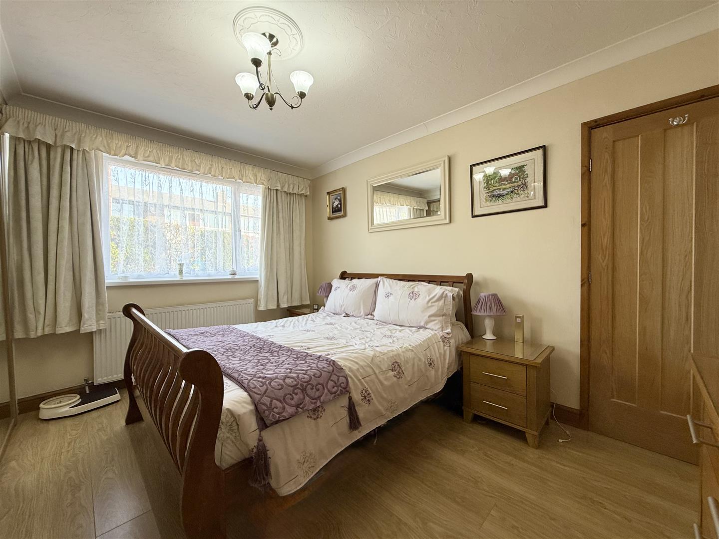 This well proportioned double bedroom benefits from a bank of fitted wardrobes with oak/mirror sliding doors, which provide good storage and hanging space, and a front facing window. The room is decorated in soft neutral tones and has wood effect flooring underfoot. A door leads you to the hallway.