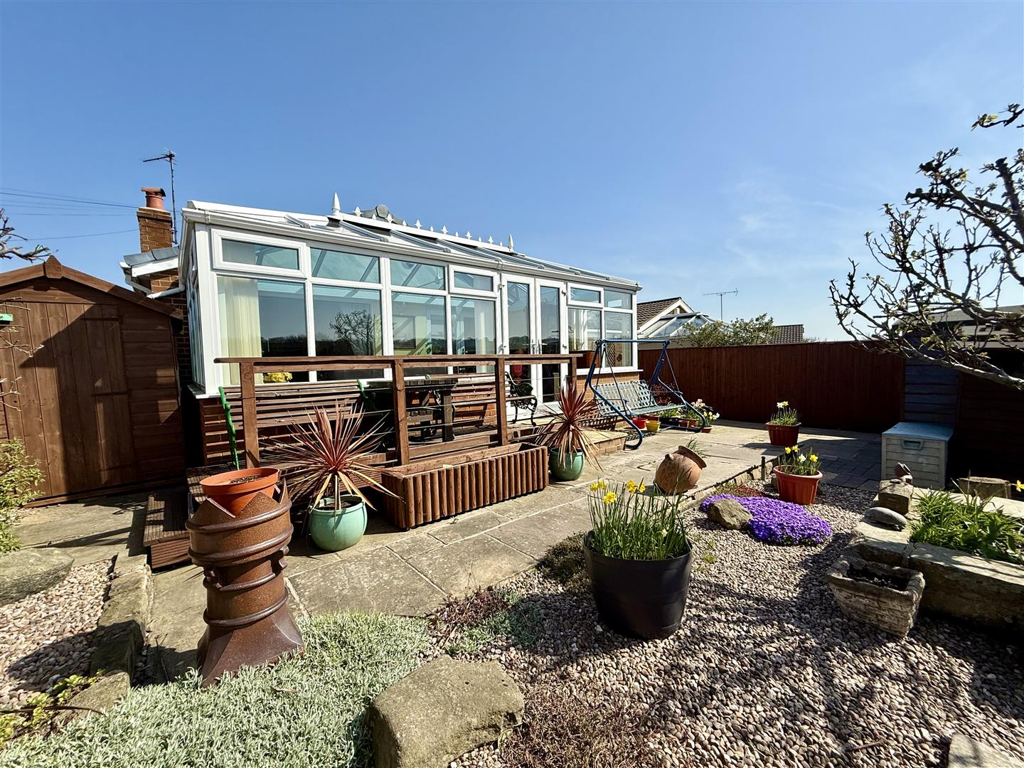 Having been transformed into a pretty low maintenance garden with decking, patio areas and pebbles, this garden is home to fruit trees, raised beds and alpines.
