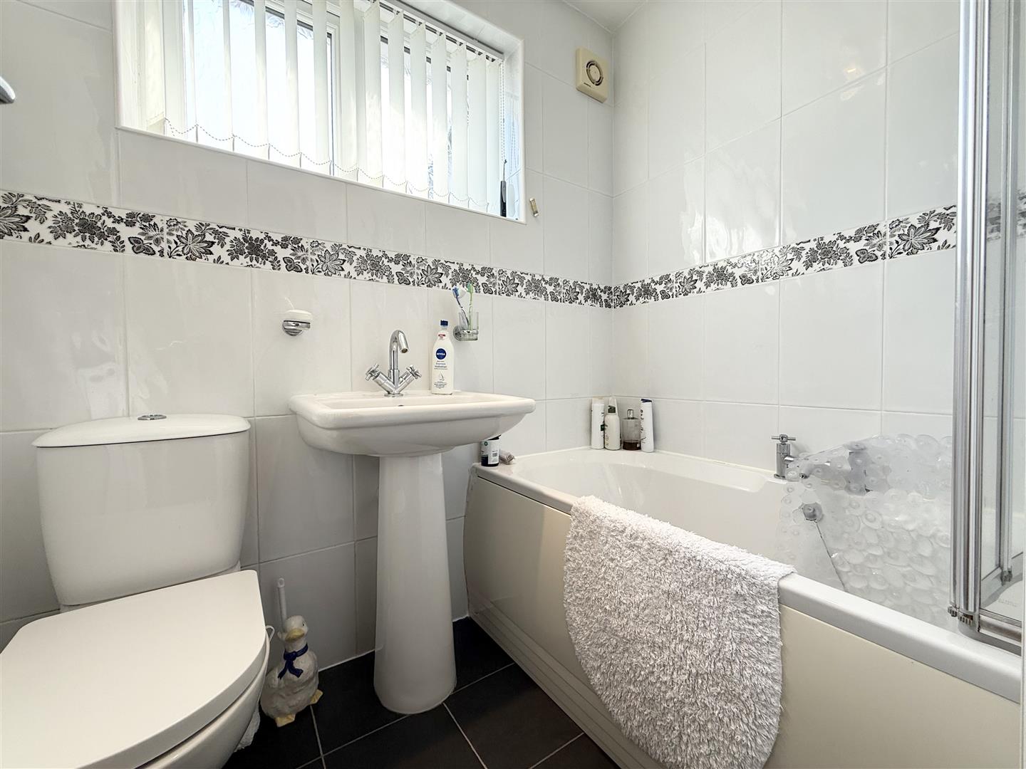 Comprising of a three piece white suite including bath with central taps and an electric shower over, pedestal hand wash basin with mixer tap and a low level W.C, this modern bathroom is fully tiled, has space for freestanding storage and a side facing obscure glazed window. There is tile effect flooring and a door leads to the hallway.