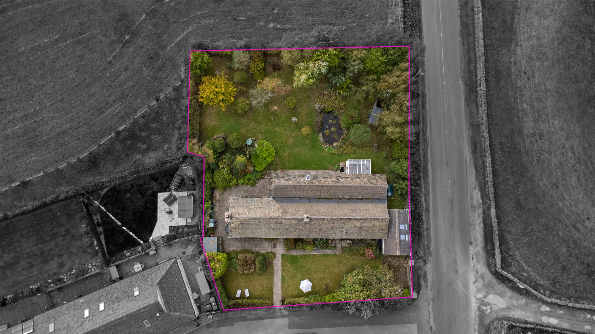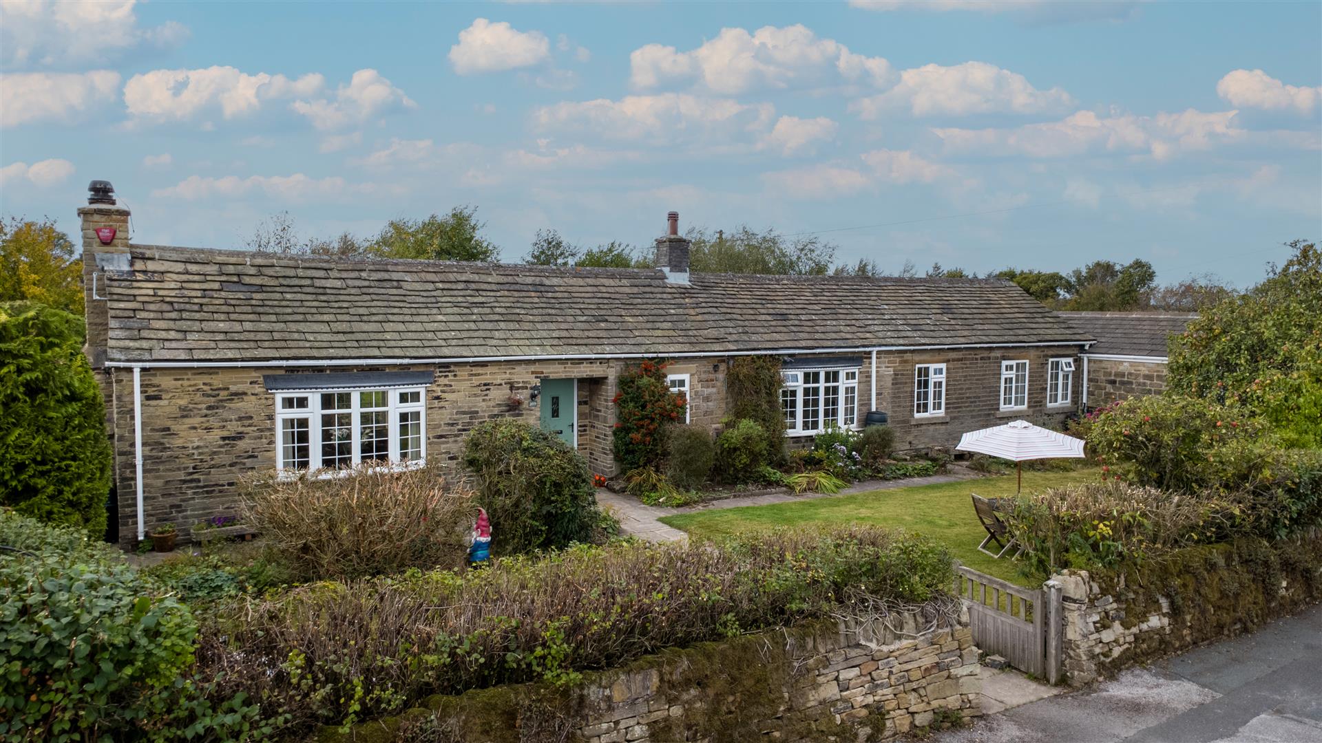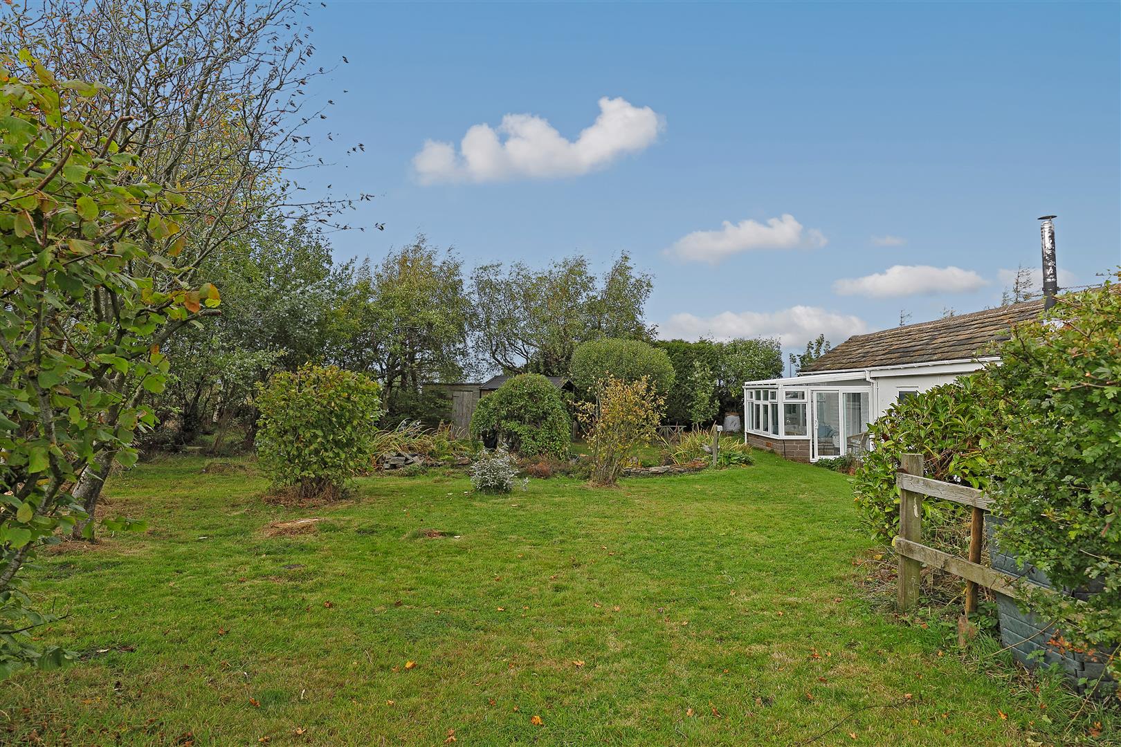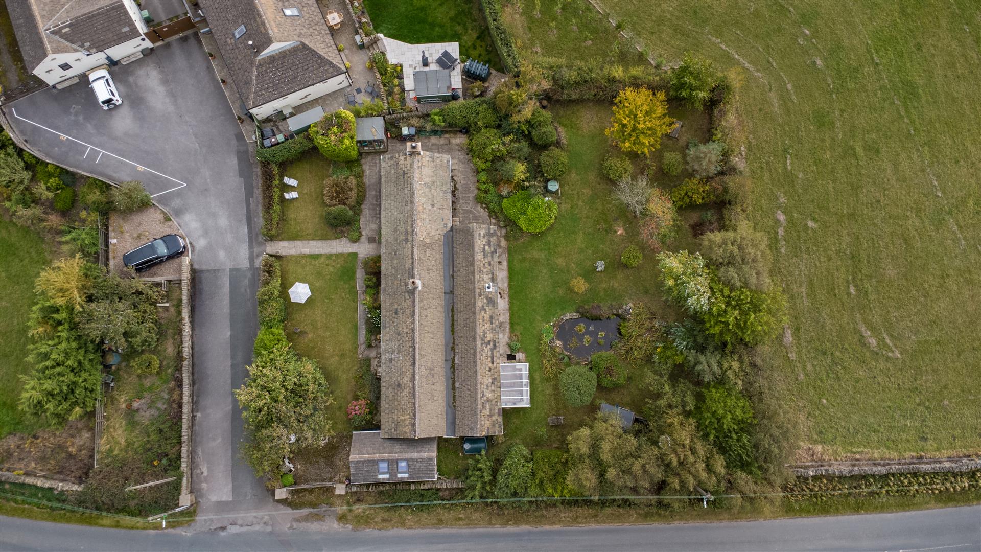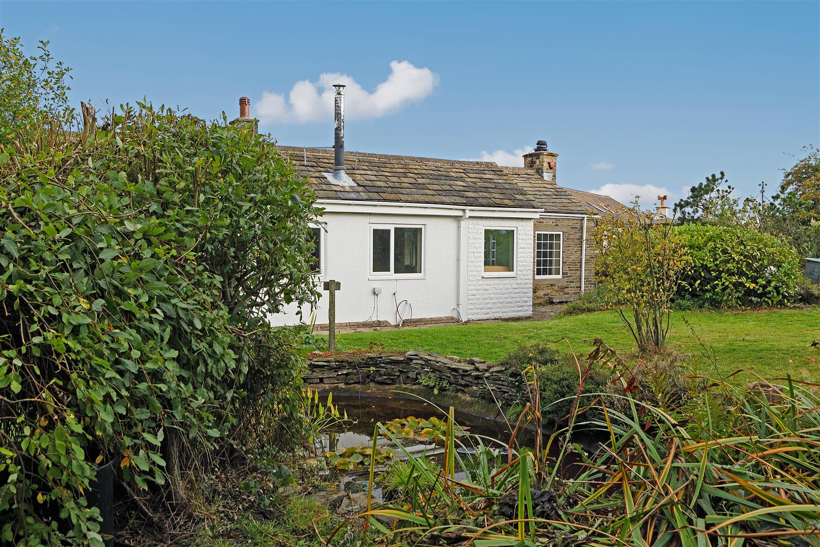 The property sits on a generous plot which extends over the access road where there are off road parking spaces and an orchard too. A stone wall encloses the garden to the front and there are fences to the rear. The garden is well established with trees and shrubs, lawns and a lovely pond to the rear along with a timber summer house too.