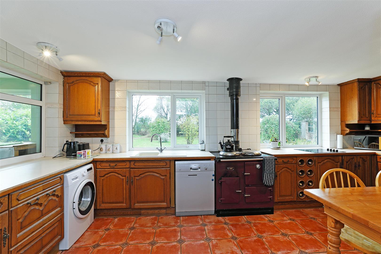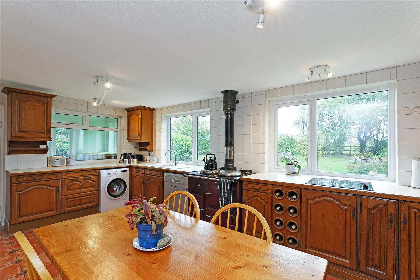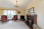 Just bursting with character having a multifuel stove in an inglenook fireplace with a tiled hearth and a timber surround as a focal point this large lounge is simply flooded with natural light having windows looking out to the gardens on three sides. The room is neutrally decorated and has carpet underfoot. Two attractive stag style chandeliers illuminate the space beautifully. A door leads to the entrance hallway.
