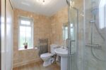 This spacious modern bathroom is fully tiled in cream tiles with a matching cream shell design bathroom suite with dark wood accessories. The suite comprises a pedestal wash basin, low level WC, a bath with a Victorian style mixer tap and a separate step in shower enclosure with an electric shower. Mosaic style vinyl flooring runs underfoot and there is a central spotlight light fitting. There is an electric heater to one wall. A high level window allows natural light to enter and a door leads to the inner hallway.