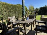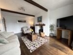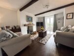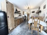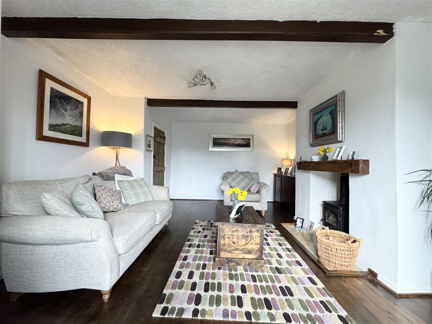 This cosy lounge has a wood burning stove in an inglenook fireplace as a focal point. Exposed timber beams add character to the neutrally decorated space and natural light floods in to the room from a set of French doors opening out to the patio area. There is ample room for lounge furniture. Rustic timber doors lead to the dining kitchen and stairs lobby.