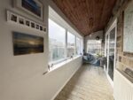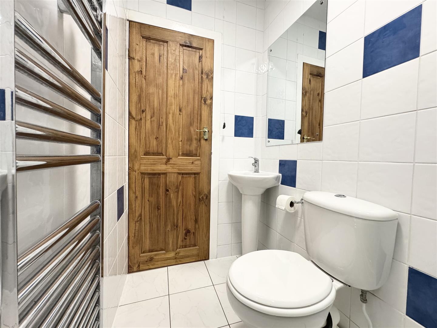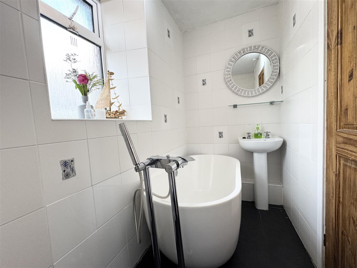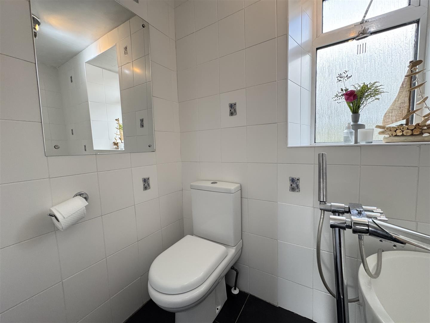 This compact bathroom is fitted with an oval freestanding bath tub with column taps, a pedestal hand wash basin and a low level W.C. The room is fully tiled with white tiles with decorative accent tiles and dark grey ceramic floor tiles run underfoot. An obscure window with a deep tiled sill allows natural light to flood in. Spotlights to the ceiling complete the room. A door leads to the landing.