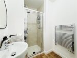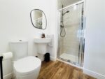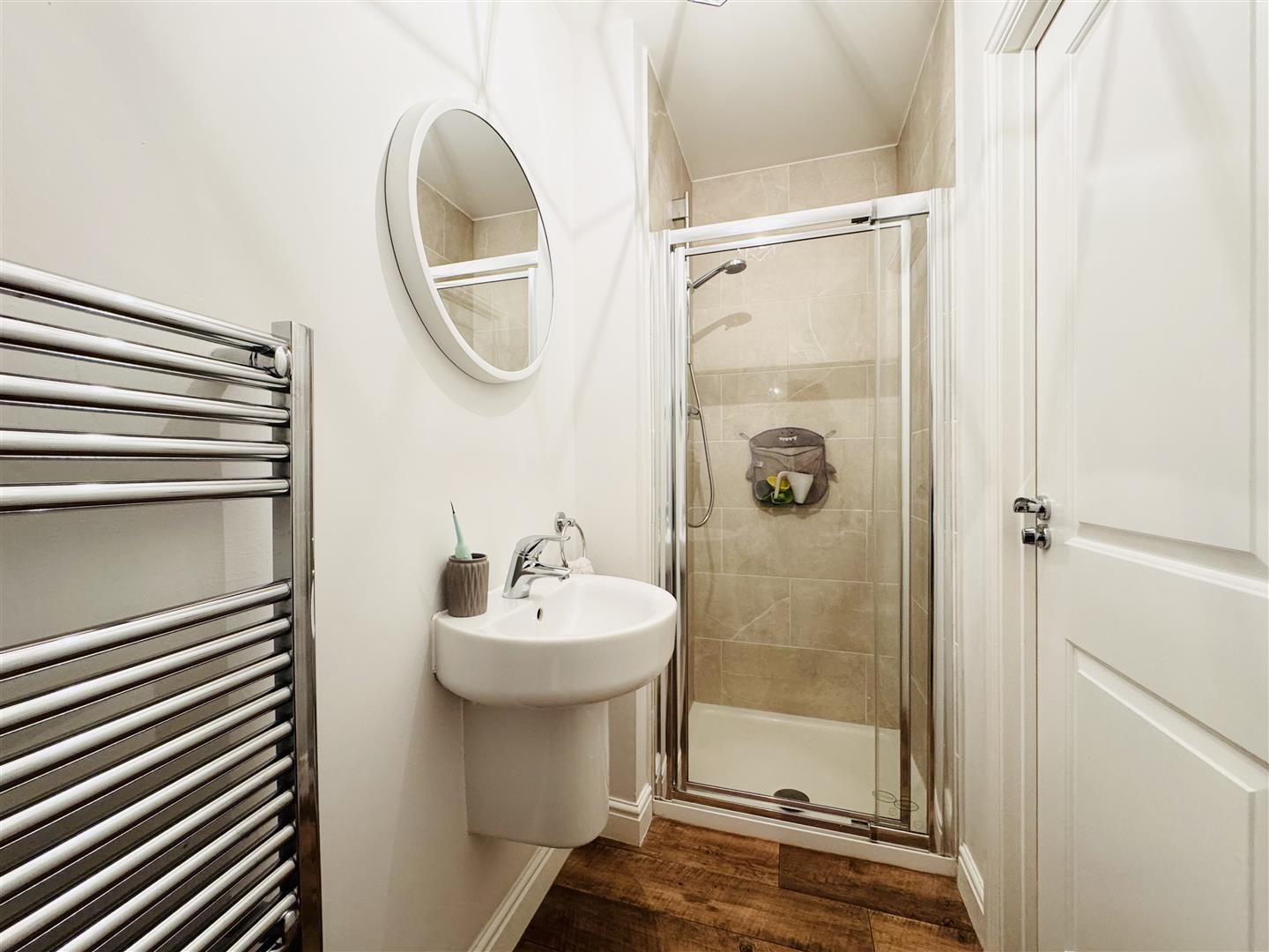 This contemporary en-suite is fitted with a three piece white suite including a glazed shower cubicle equipped with a black thermostatic mixer shower, low level WC and wall mounted hand wash basin with mixer tap. There are neutral tiles to the shower, vinyl flooring and a heated towel rail. A door leads to bedroom one.