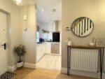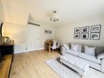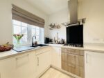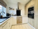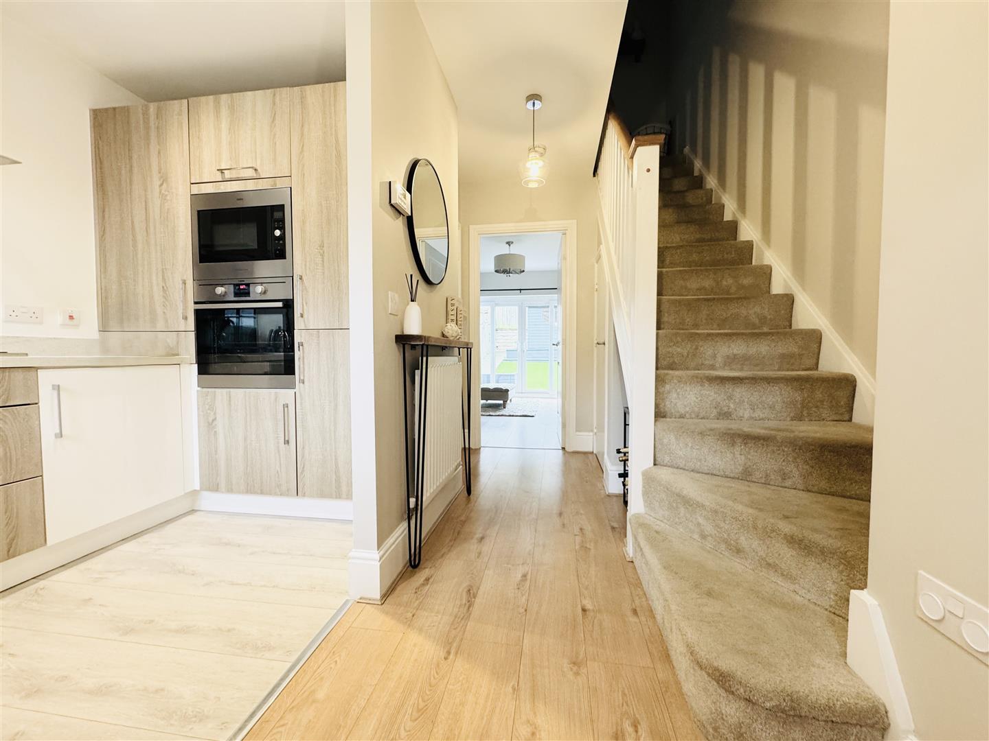 Located to the front of the property with a large window allowing natural light to enter, this contemporary kitchen is fitted with a range of white and oak effect wall and base units, laminate work surfaces with matching up stands and a one and a half bowl black quartz sink and drainer with mixer tap over. Integrated appliances include a tall fridge freezer, electric oven, microwave, dishwasher and four ring gas hob with extractor fan over. Pale wood effect laminate flooring and spotlights to the ceiling complete the room. An opening leads back to the entrance hall.