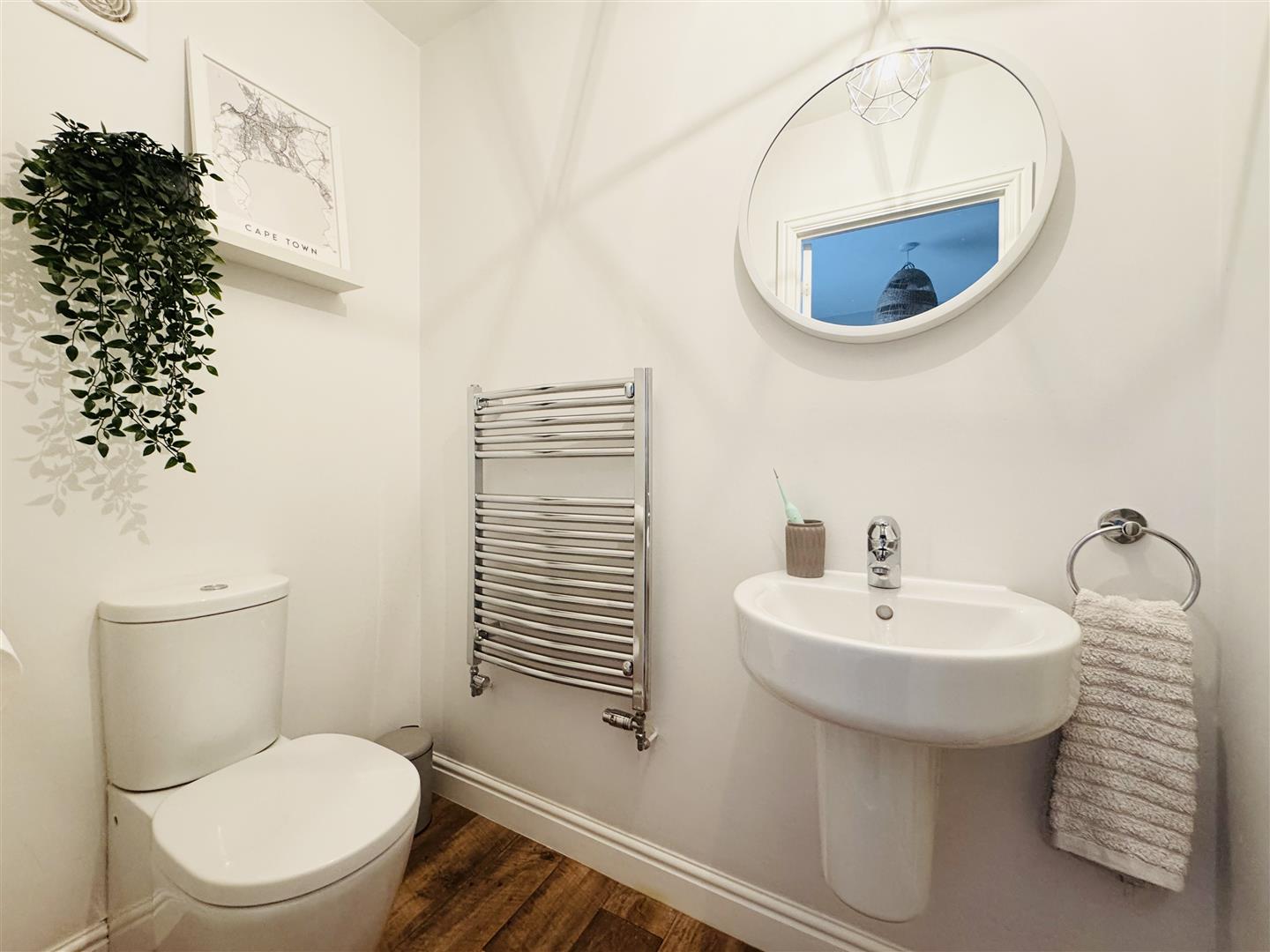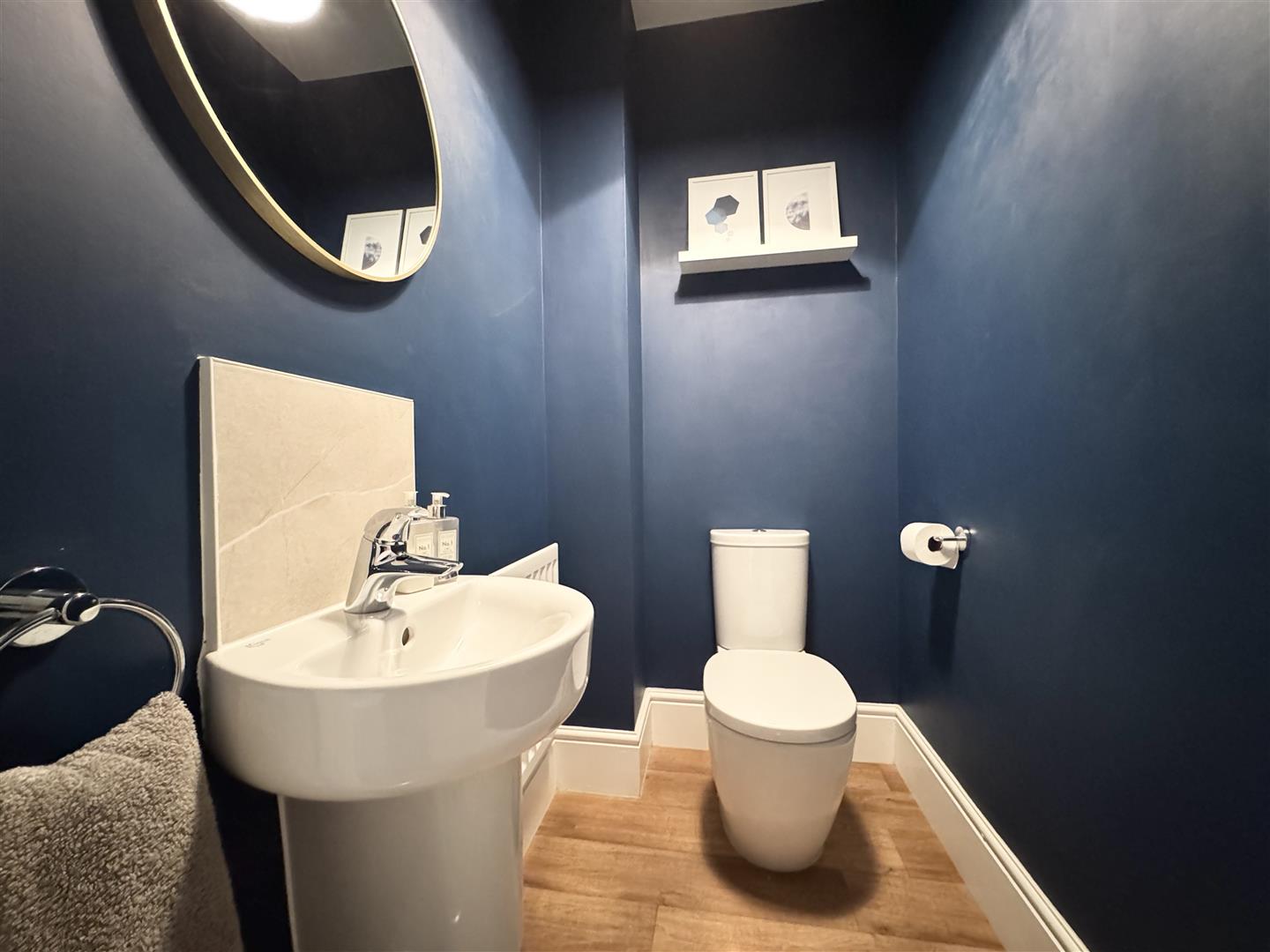 Handily located just off the hallway, this downstairs WC is fitted with a white low level WC and a wall mounted hand wash basin. There are tiles around the sink and vinyl flooring. A door leads to the entrance hall.
