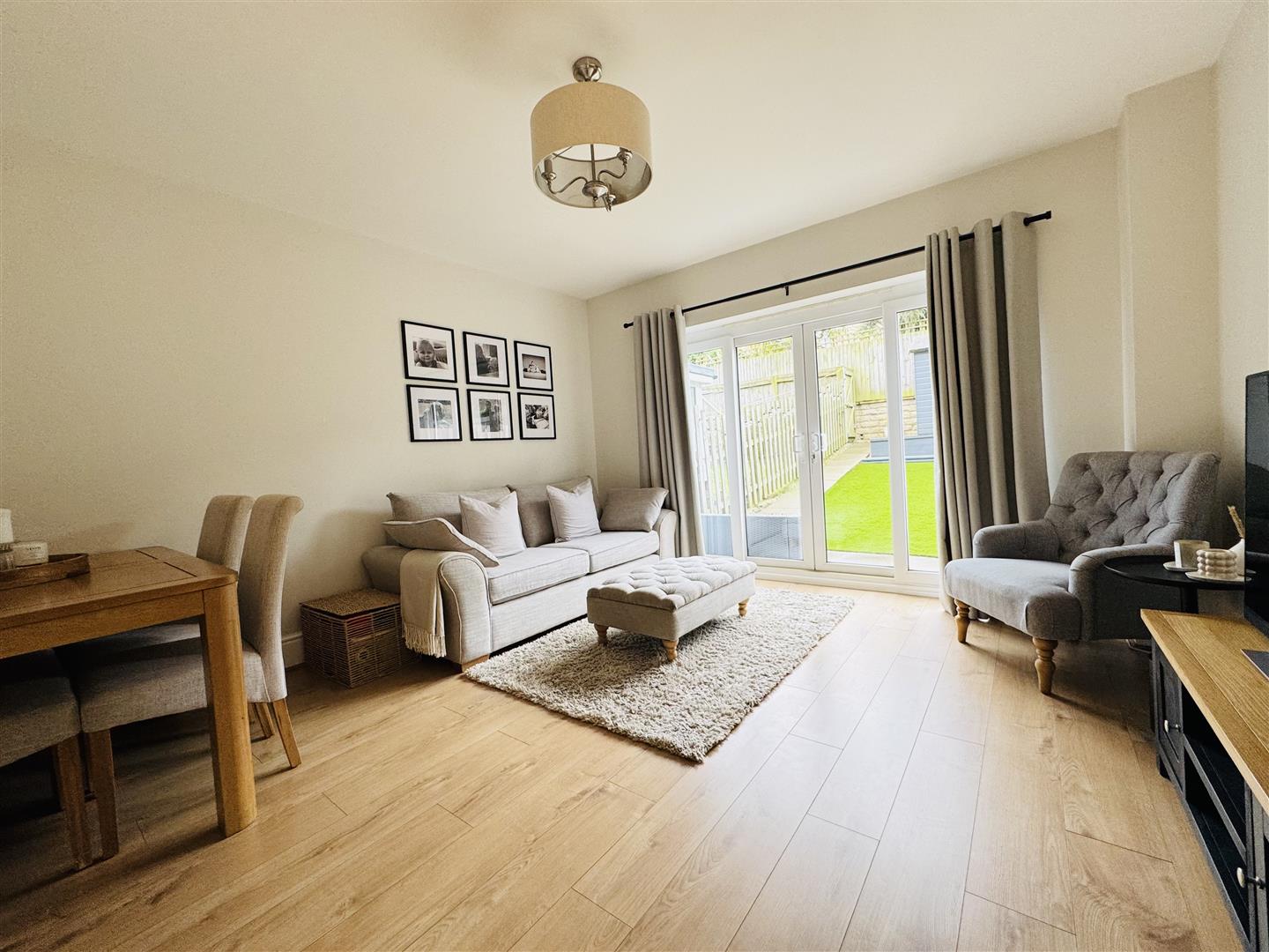 Bursting with natural light courtesy of the sliding patio doors which lead out to the garden, this fantastic lounge has plenty of space for free standing living and dining room furniture and has neutral décor with oak effect laminate flooring underfoot. A door leads to the entrance hall.