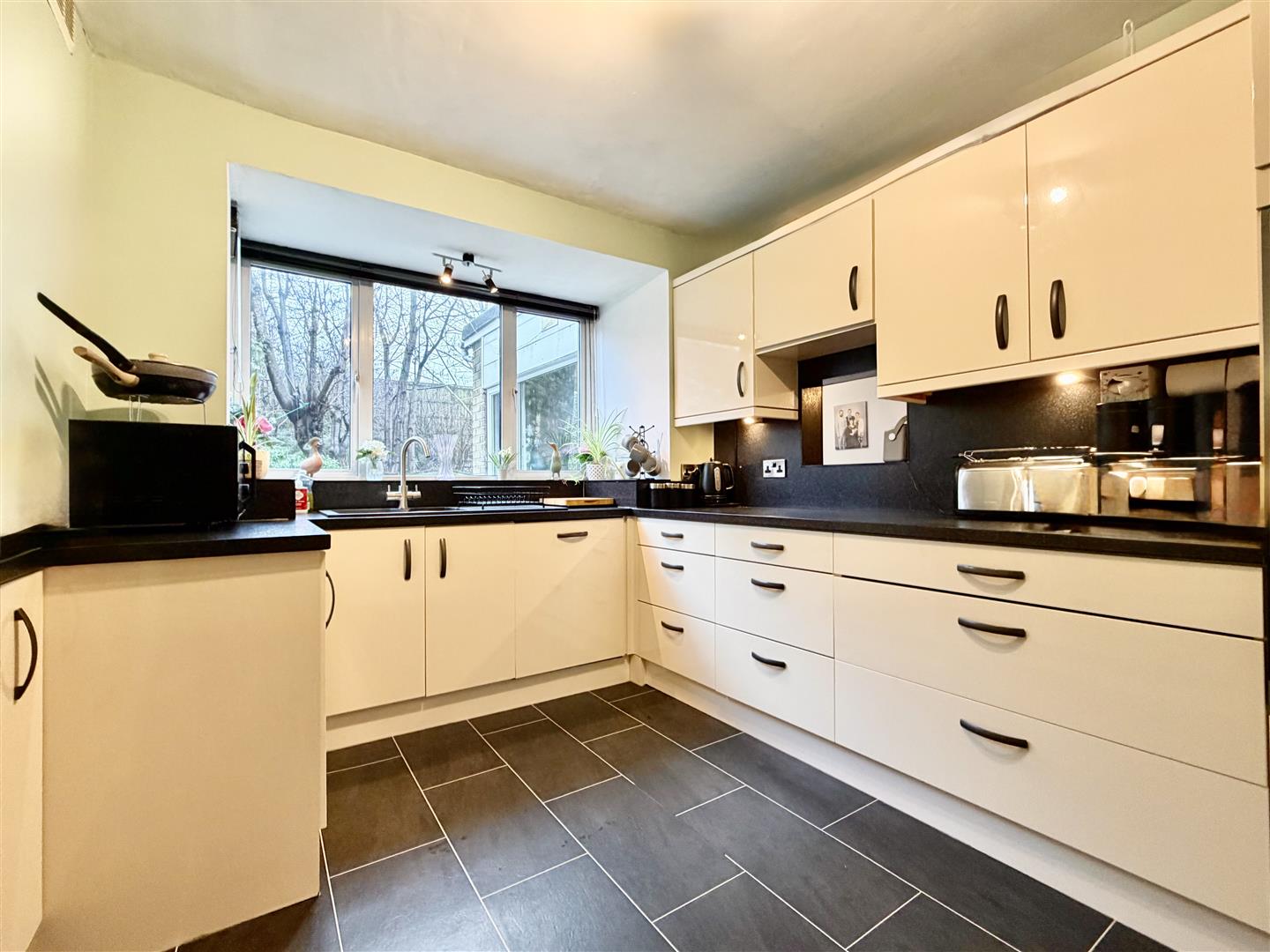 Positioned to the rear and being fully fitted to a high standard with a comprehensive range of modern wall and base and drawer units with contrasting granite effect work surfaces and matching splashbacks, integrated oven, microwave, four plate induction hob with extractor hood over and window overlooking rear garden.
