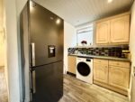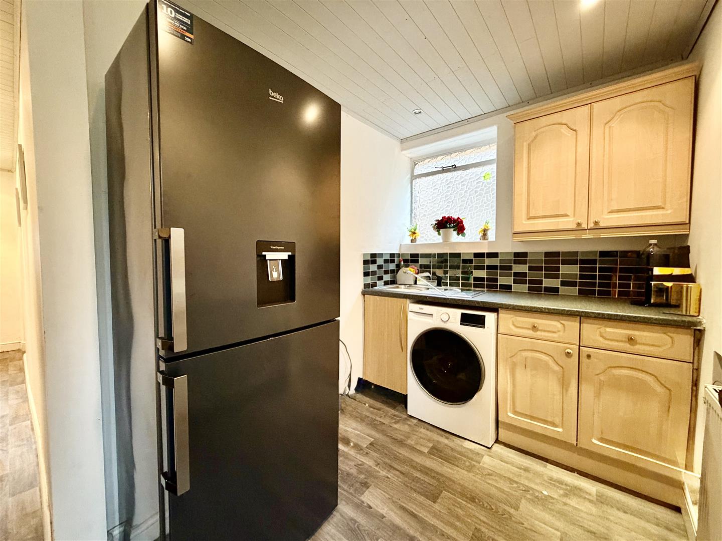 A very useful additional space being fitted with beech effect wall and base cupboard units with inset single drainer sink unit, granite effect work tops with block tiled splashbacks, plumbing for automatic washing machine, recessed spotlighting to the ceiling, space for a 'fridge/freezer and rear door to garden.