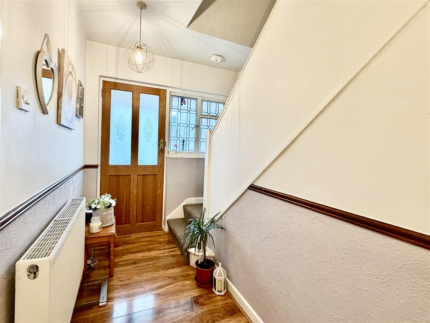 You enter the property via the porch into this welcoming hallway being neutrally decorated with wood effect flooring underfoot, useful understairs store, staircase leading to the first floor and internal doors to living room, sitting room, kitchen and side entrance.