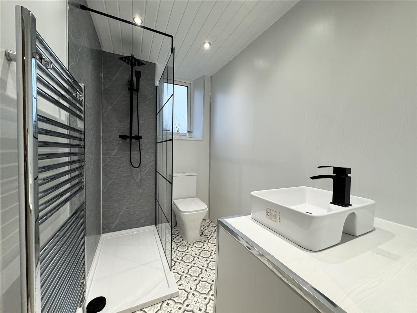 This recently updated shower room is fitted with a walk in shower with a black waterfall thermostatic shower, a vanity bowl handwash basin with mixer tap and a low level toilet. Grey woodgrain and contrasting marble effect aqua boards adorn the walls. Grey patterned vinyl flooring runs underfoot. A panelled ceiling with spotlights and a chrome heated towel radiator complete the room. An obscure window allows natural light to enter and a door leads to the landing.