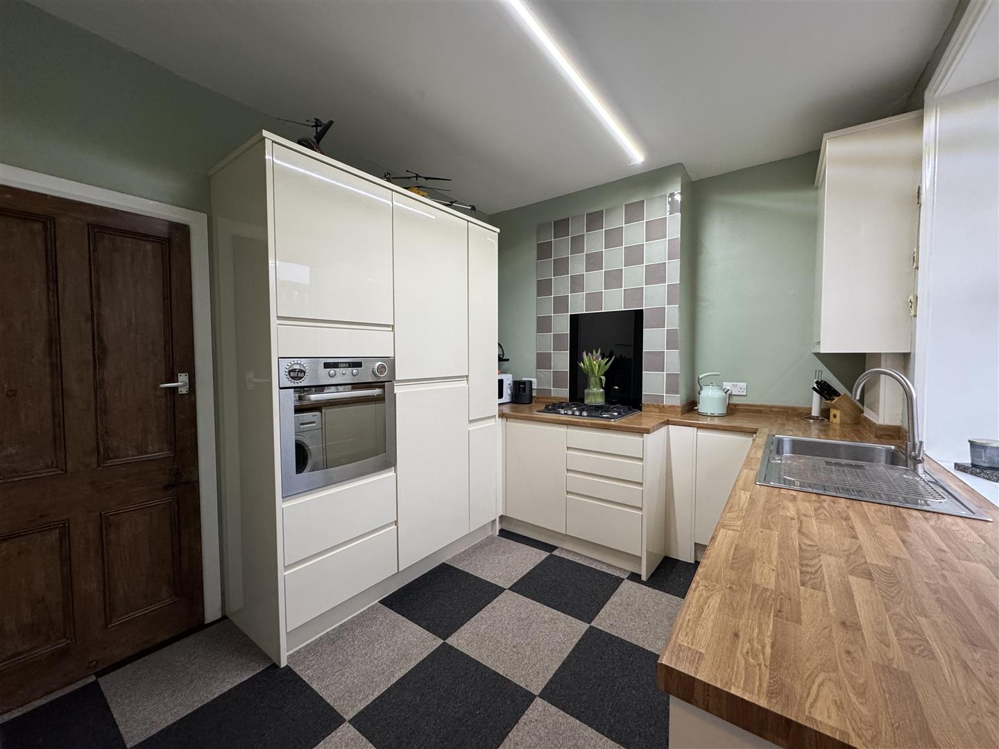 Positioned to the rear of the property with a window looking out to the rear yard and fields beyond, this modern kitchen is fitted with cream gloss base and wall units, wood effect worktops, tiled chequerboard splashbacks and a stainless steel sink and drainer with mixer tap. Cooking facilities comprise of a gas hob and electric oven. Appliances include a tall freestanding fridge freezer and there is plumbing for a washing machine. To one corner sits a useful understairs cupboard. Carpet tiles run underfoot and a carpeted staircase ascends to the first floor landing. A part glazed uPVC door leads out to the rear yard and a door leads to the living room.