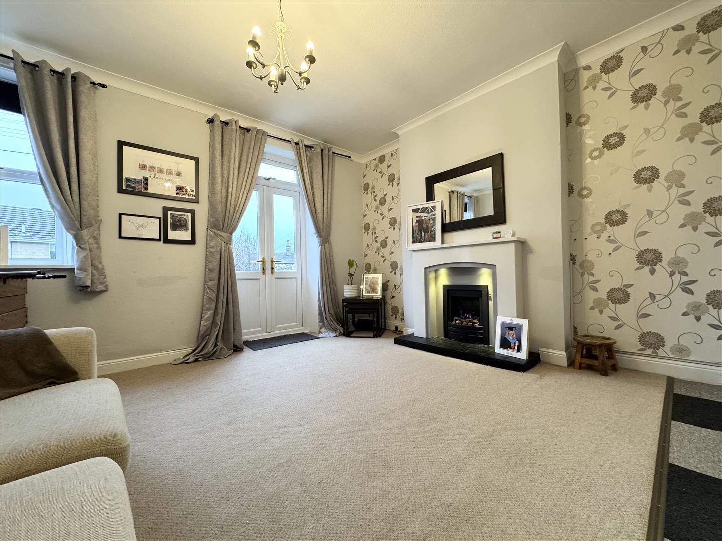 You enter the property through a set of French doors into the living room which is neutrally decorated with a gas fire in a black granite surround as a focal point and ample space for lounge furniture. There is room to accommodate a dining table and chairs to one end. Doors lead to the kitchen and cellar.