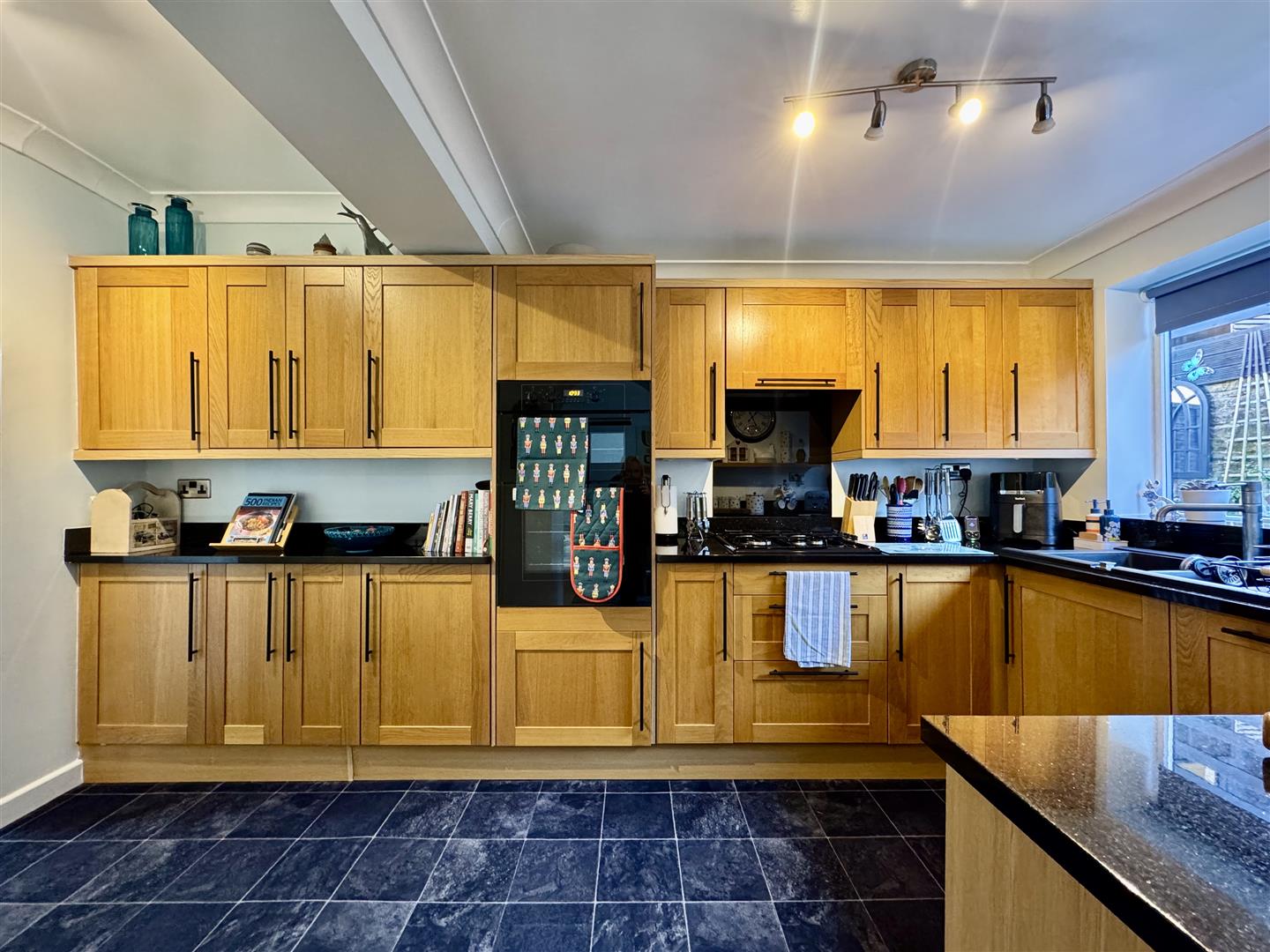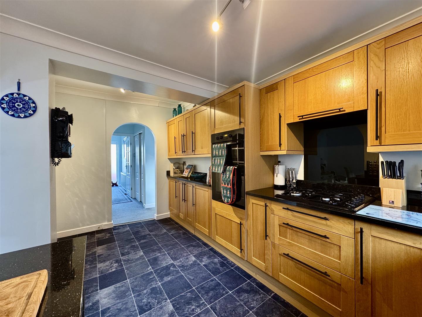 Located to the rear of the property, this modern kitchen has a window with a view over the rear garden, timber wall and base units, granite work surfaces with matching upstands and a large composite sink and drainer with mixer tap over. There is an integrated electric oven with grill, four ring gas hob with concealed extractor fan over, a fitted dishwasher and space for an undercounter fridge. An archway leads to the dining room and a door opens to the utility room.