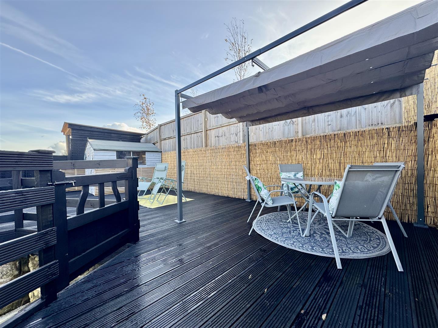 Accessed from a wrought iron gate from the driveway, the utility room or through the sliding patio doors from the dining room is a lovely enclosed patio ideal for outdoor dining and entertaining, stone steps ascend to a large decked area offering ample space for garden furniture and a timber outbuilding if desired.