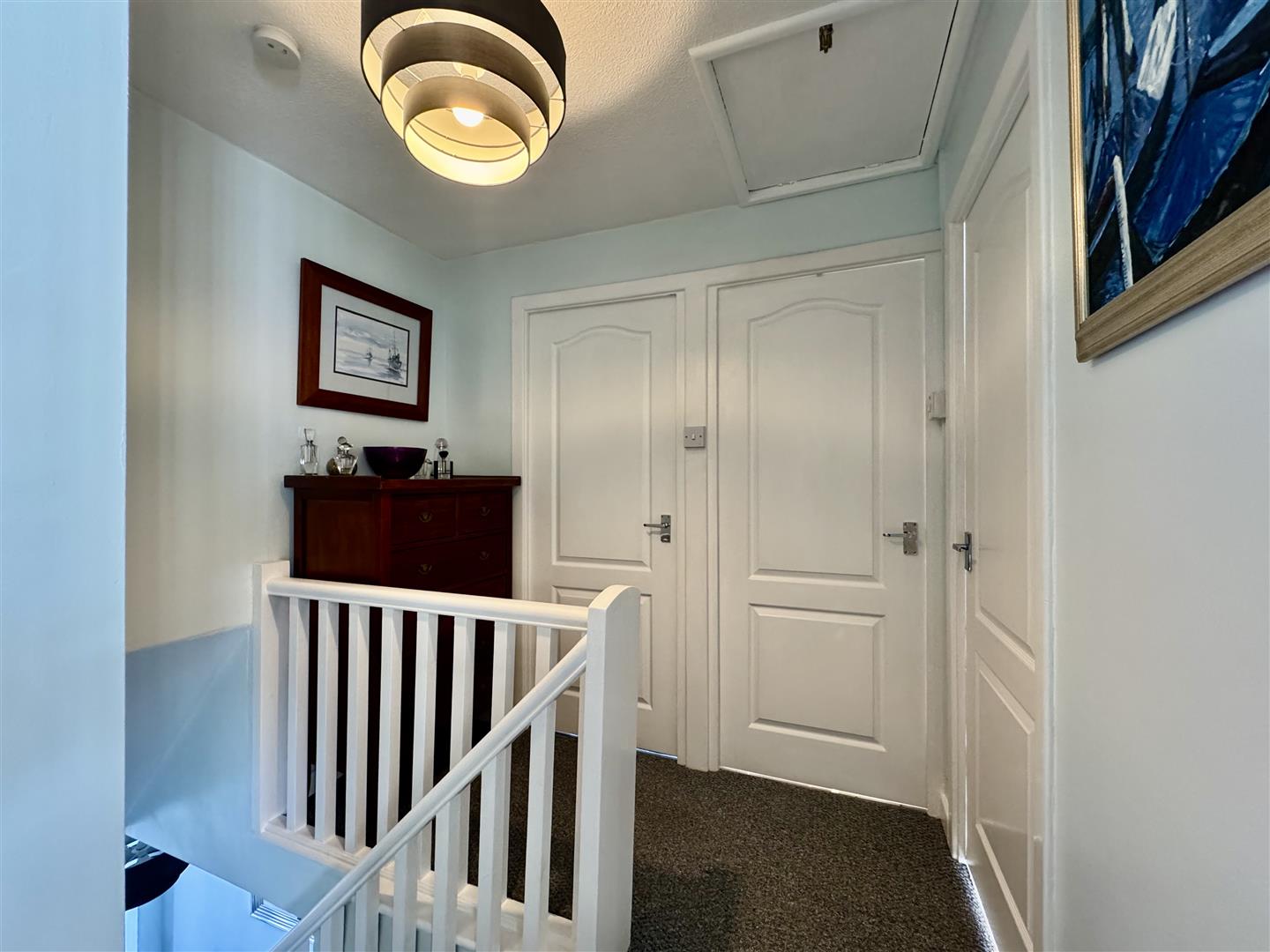 Stairs ascend from the entrance hallway to the split first floor landing with space for freestanding furniture, doors lead through to the four bedrooms (one with an ensuite shower room) and the house bathroom. A ceiling hatch gives access to the loft.