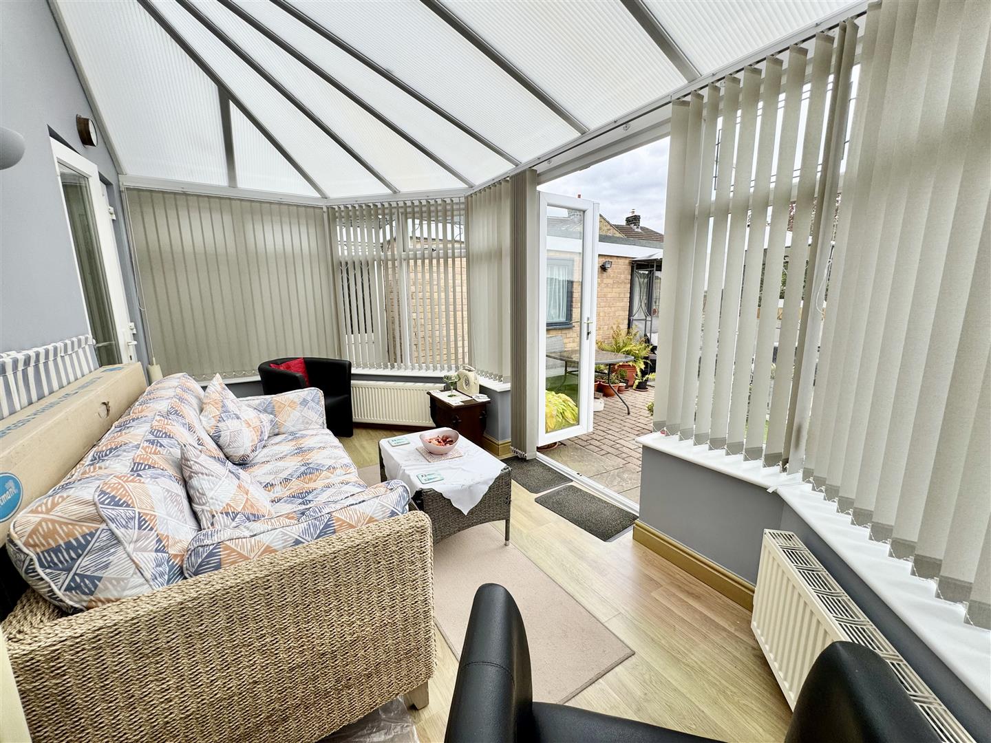 Good size conservatory and useful extra space, again, with many potential uses. Built with a solid base and having double glazed window, the room is flooded with natural light and has delightful views of the garden. There are two wall mounted radiators, wall lights, laminate flooring and power points. French doors lead to the garden and to the third bedroom.