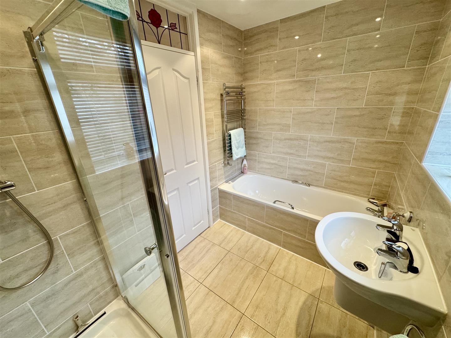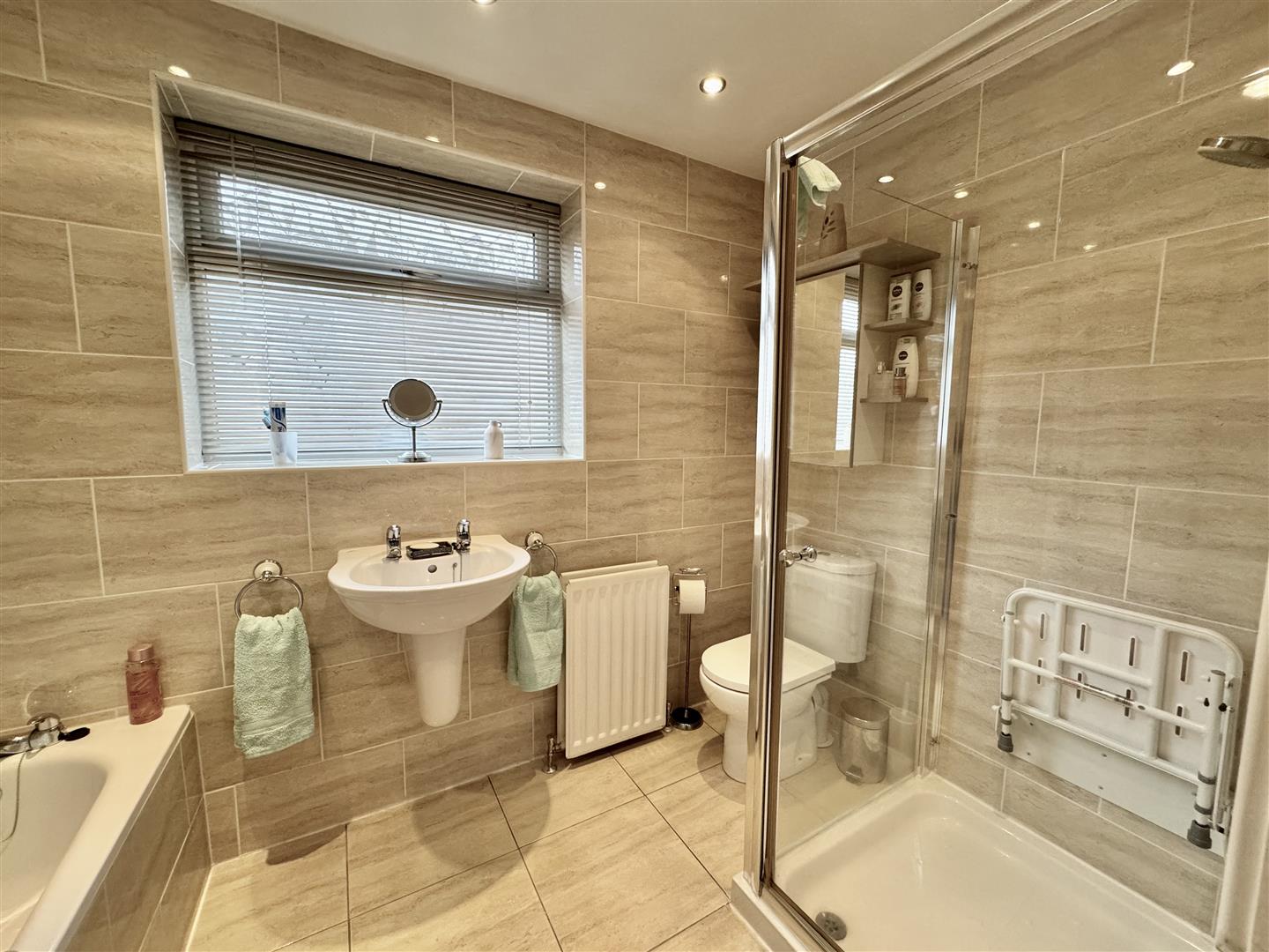 Stylish bathroom having a four piece suite in white consisting of tiled panel bath, separate tiled shower enclosure with thermostatic shower, wall mounted wash hand basin and twin flush low level WC. Natural light is brought in via the double glazed window with obscure glass, there is a wall mounted radiator plus the chrome towel radiator, inset ceiling spotlights and extractor fan. An internal door leads to the hallway.