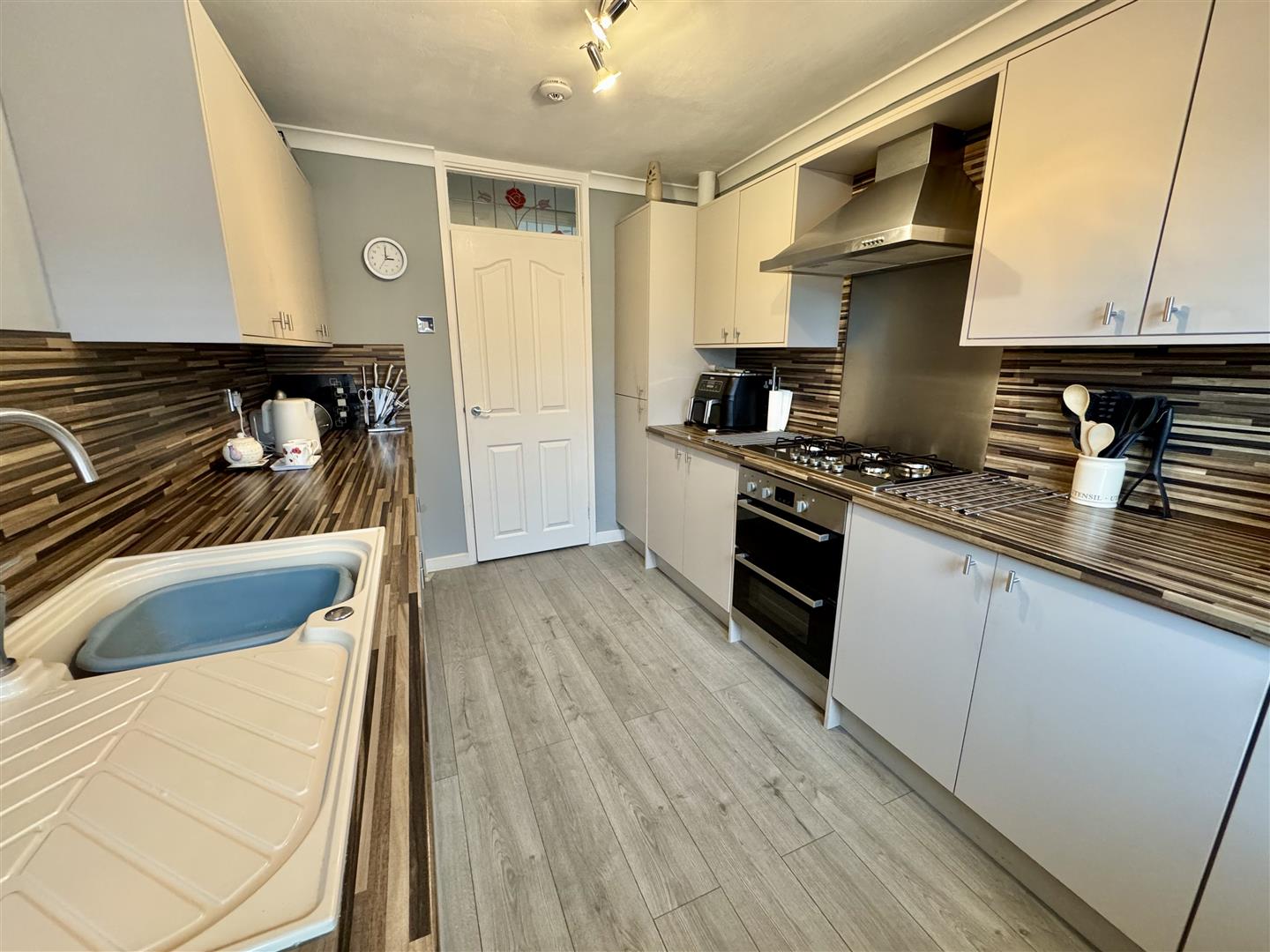 Modern kitchen having a great range of wall and bae units with a neutral finish, complimentary Zebrano style worktops with matching splashbacks and composite sink with mixer tap. Integral appliances come in the form of an electric double oven, five ring gas hob with stainless steel hood over under counter fridge and freezer. There is plumbing for a washing machine with plenty of natural light coming in from the double glazed window to the side and uPVC door, also to the side, which has a double glazed panel. Laminate flooring runs underfoot, there are ceiling spotlights and coving to the ceiling. An internal door leads to the hallway.