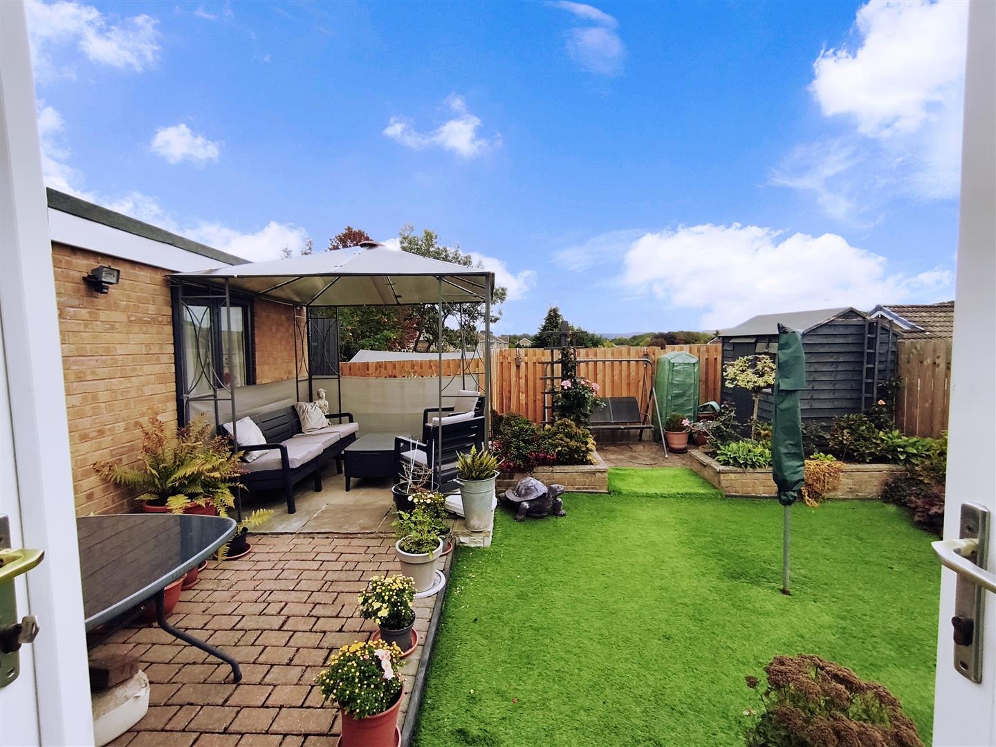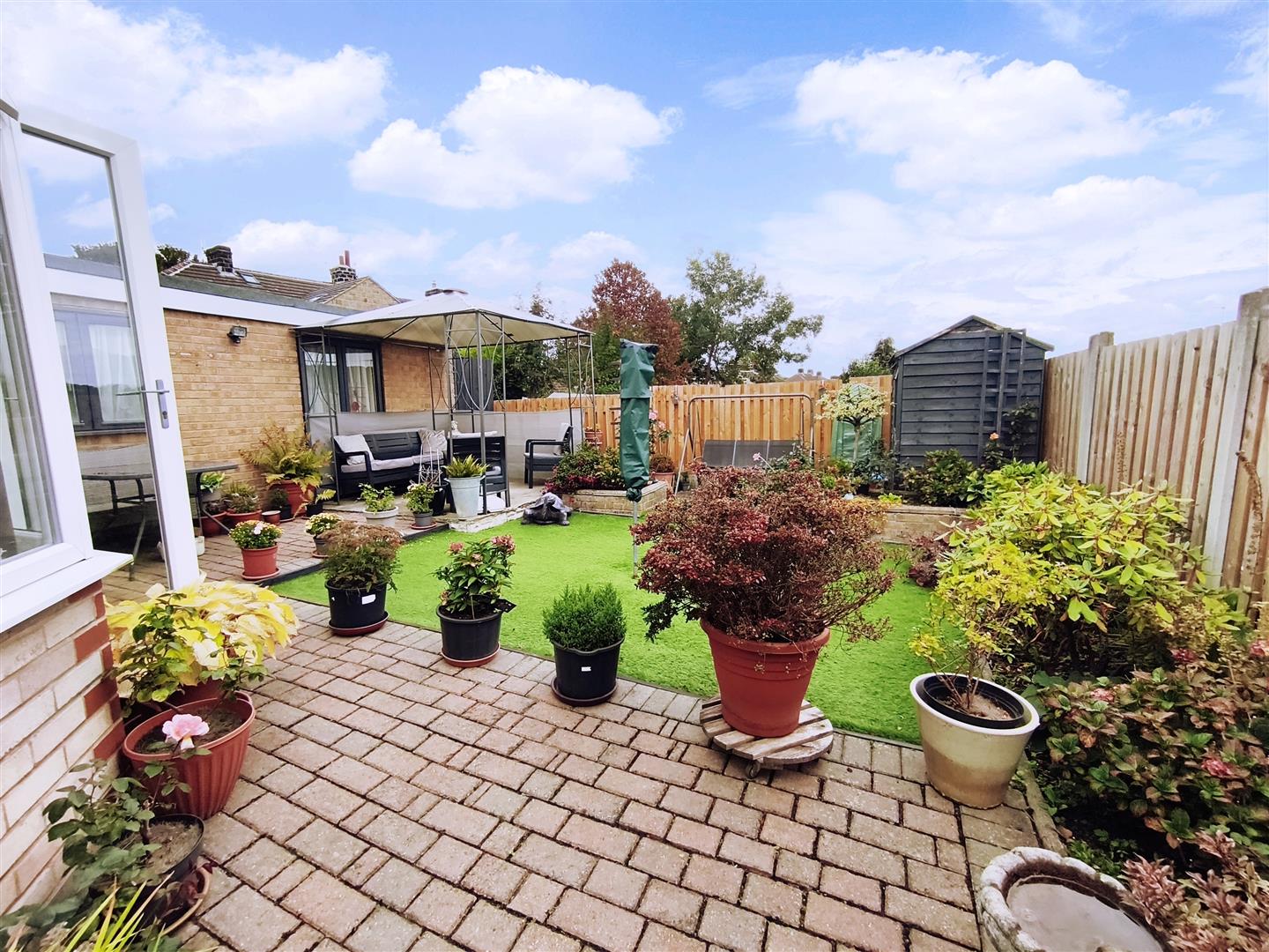 Fabulous rear garden having an array of established plants, flowers and shrubs. There are block paved patio area and a paved patio space with room for a gazebo (can be negotiated on) plus there is a garden shed. There is an artificial lawn, secure side access to the front and is enclosed by timber fence.