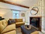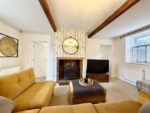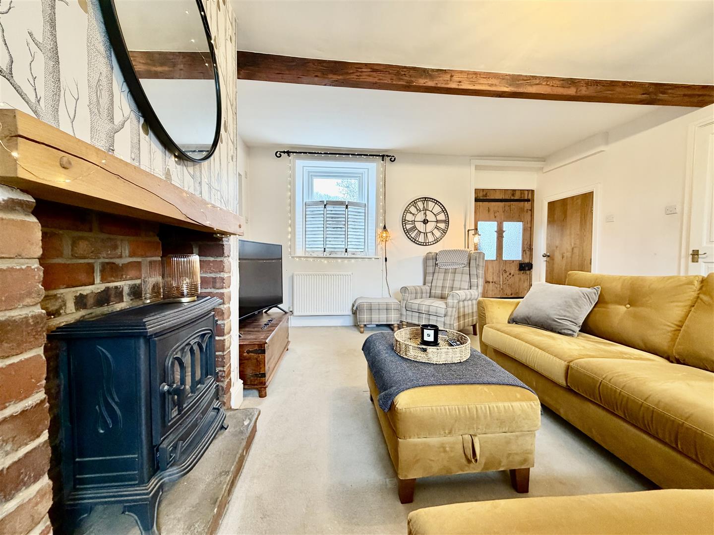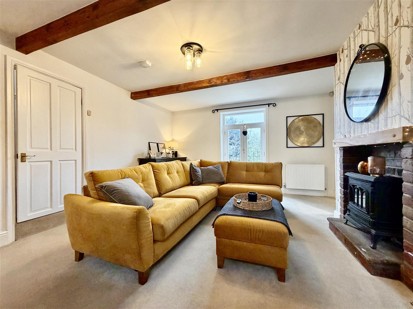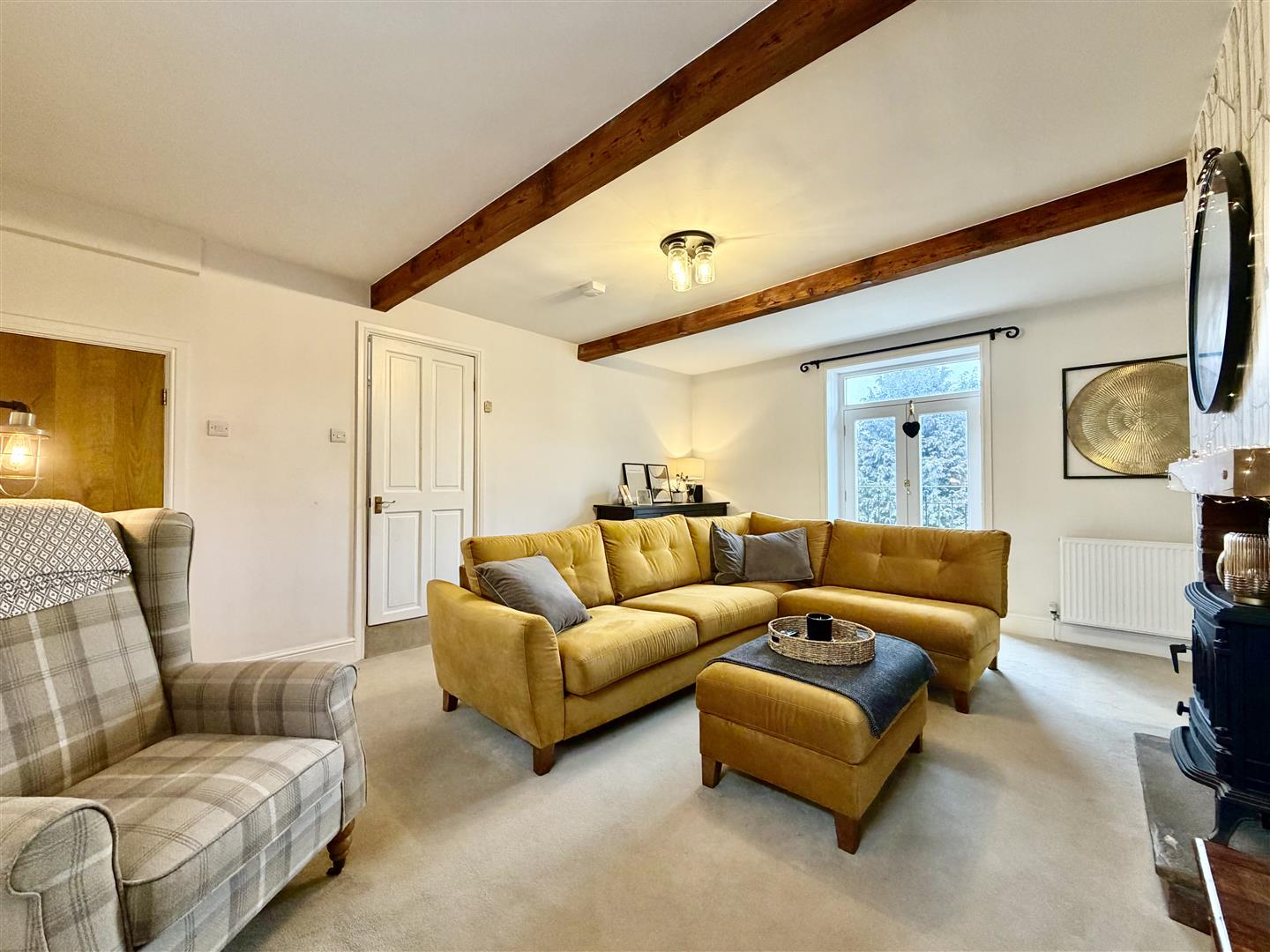 A bright and spacious yet extremely cosy living room with generous space for freestanding furniture and including a feature stove effect gas fire set within a stone hearth and brick fireplace with feature ceiling beams, double glazed window and double doors with Juliet balcony allowing space for pot plants and distant views. Doors lead to bedroom three, bathroom as well as upper and lower levels.