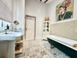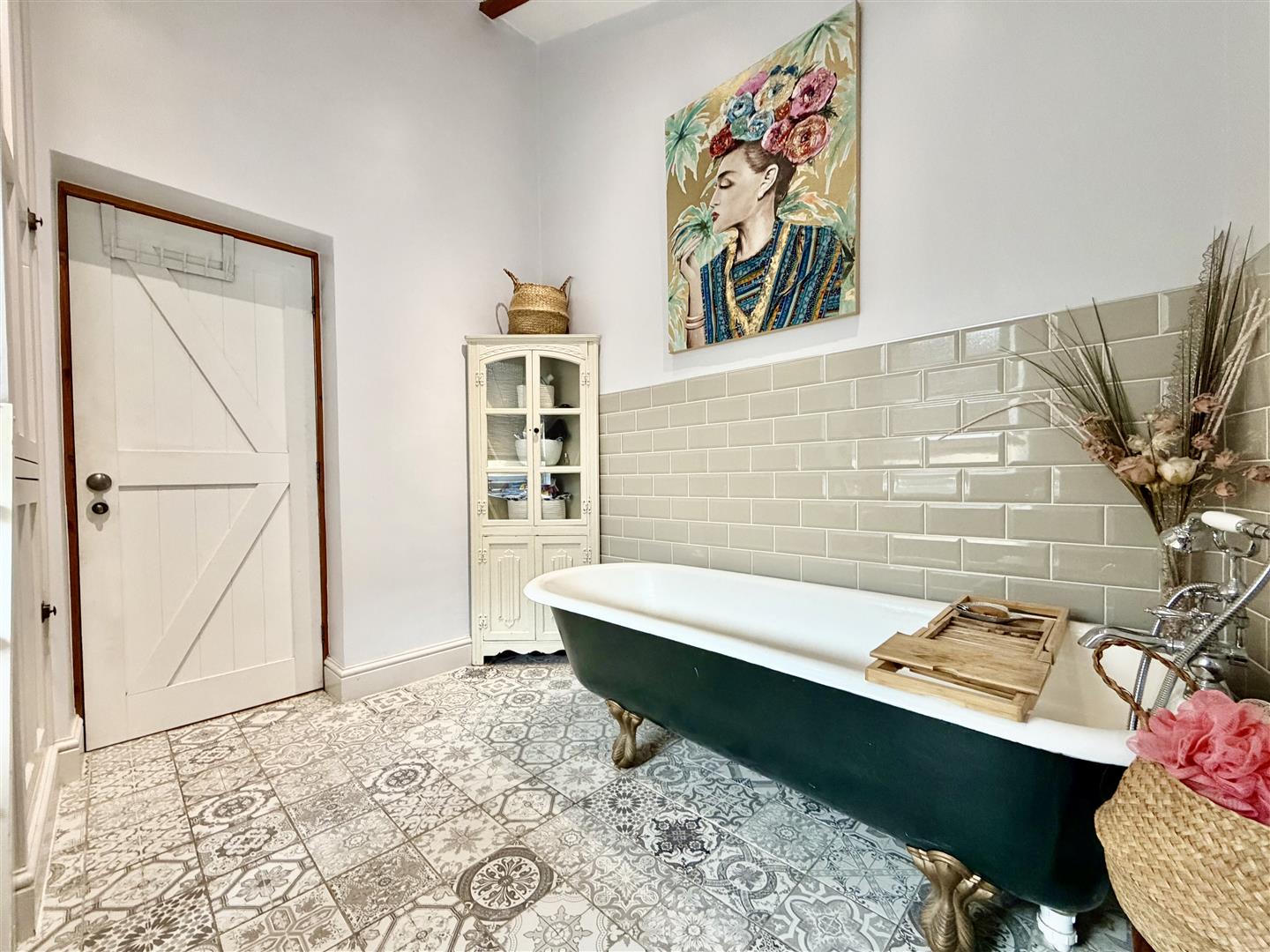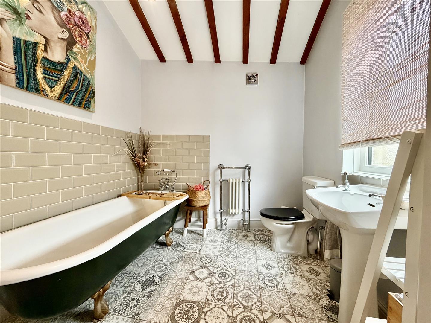 Being of a particularly good size, positioned off the living room with feature open vaulted ceiling, luxuriously appointed with a period three piece white suite including a low level w.c, pedestal hand wash basin, freestanding roll top bath with claw feet and attractive contrasting part block tiled surround, pattern tiled flooring, towel rail radiator, cupboard housing Viessmann gas combination boiler and double glazed window.