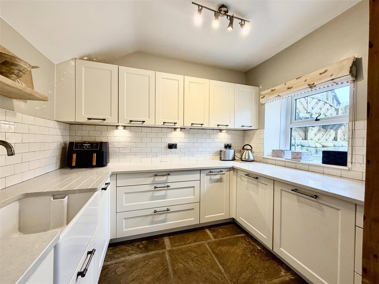 A most impressive and spacious kitchen positioned to the lower ground floor and fitted with a comprehensive range of wall, base and drawer cupboard units with matching polished granite work surfaces and block tiled splashbacks, inset ceramic Belfast sink unit, integrated fridge, freezer, dishwasher and microwave grill, space for slot in Stoves gas range with extractor hood over, stone flagged flooring underfoot, two double glazed windows allowing light to flood the room and open entrance area with feature log burning stove set within a brick fireplace surround, door to utility and stable door giving access to the garden with open timber storm porch.