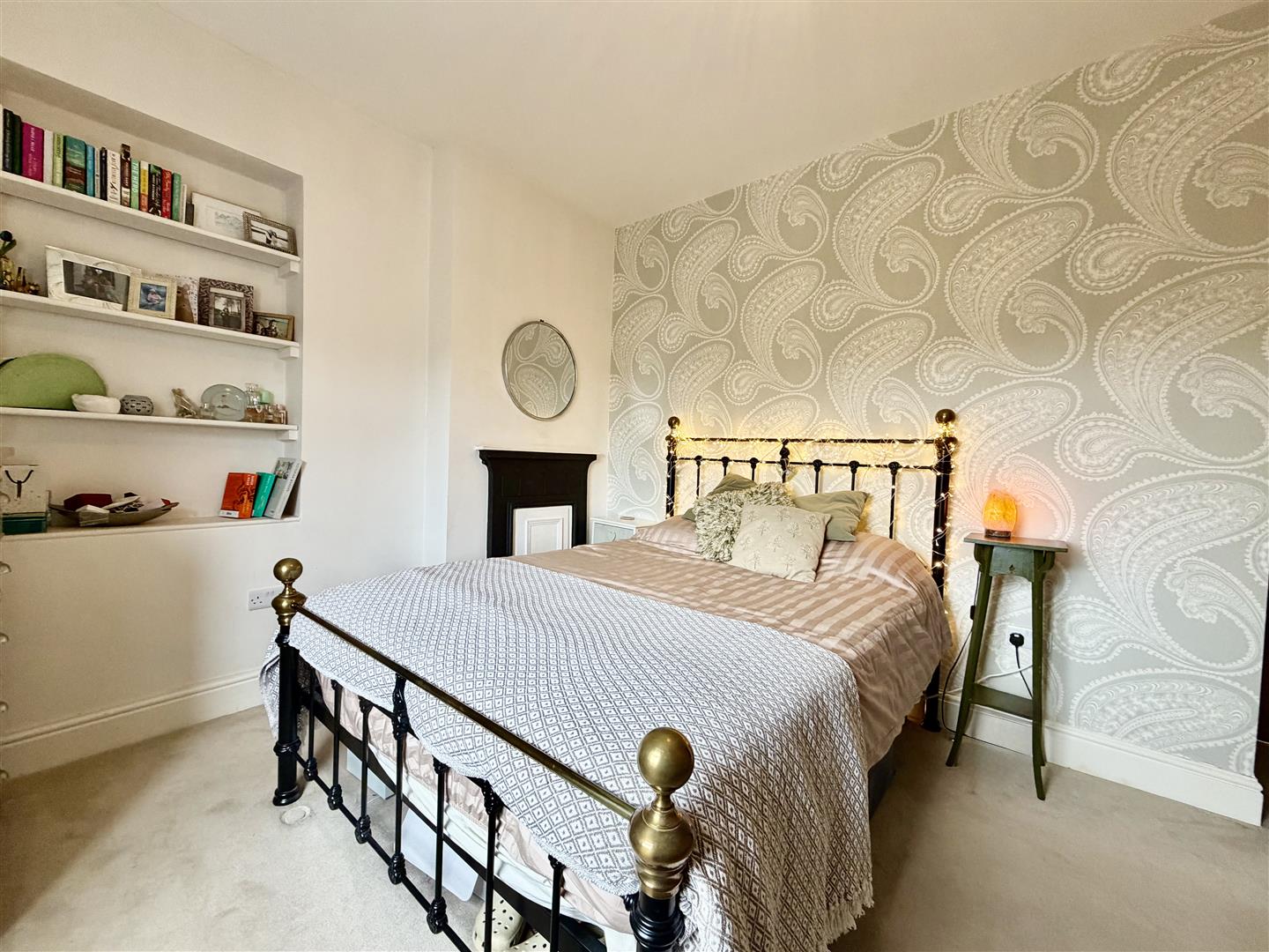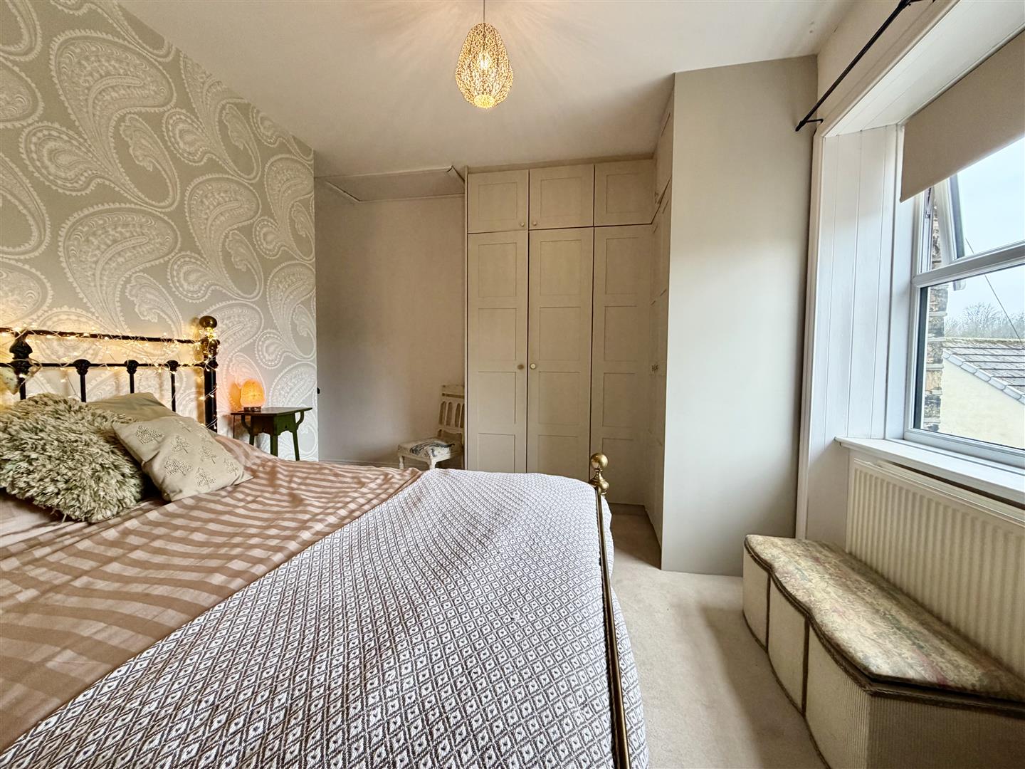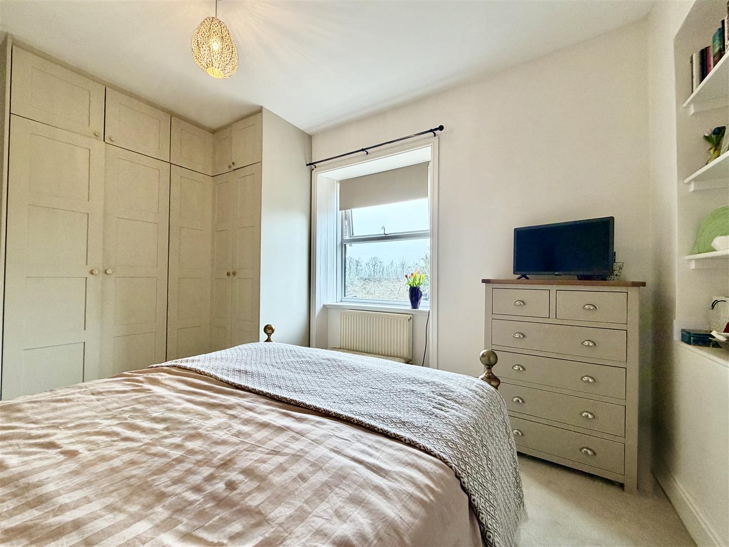 A bright and spacious principal bedroom having both fitted wardrobes and space for freestanding furniture with further fitted shelving, space for double bed and double glazed window overlooking the garden and views beyond.