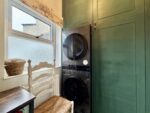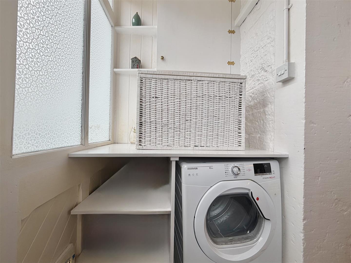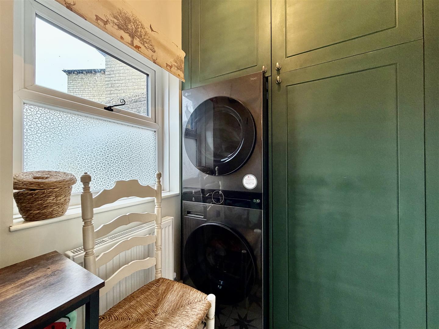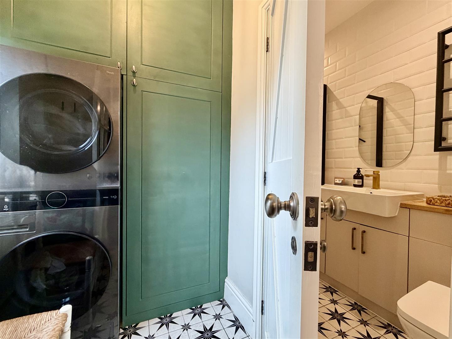 A very useful additional space, conveniently positioned just off the kitchen and entrance area having fitted storage with space for washer/dryer tower, attractive pattern tiled flooring frosted double glazed window and door to shower room.