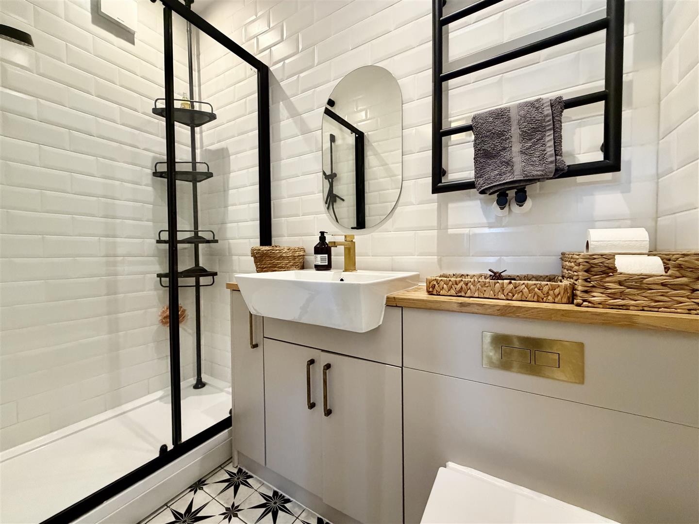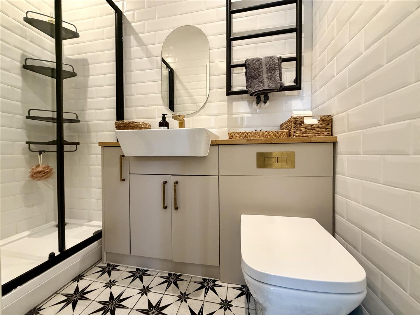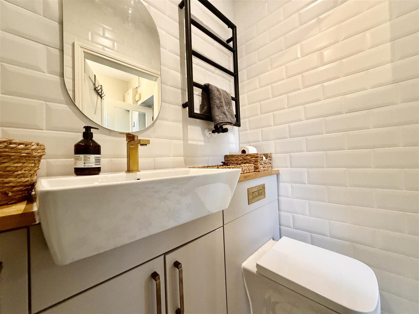 Being positioned just off the utility and luxuriously appointed with a contemporary three piece white suite with block tiled surround and tiled flooring underfoot, fitted low level w.c with concealed cistern, hand wash basin with contrasting vanity surround storage, tiled shower cubicle with sliding door and wall mounted towel rail radiator.
