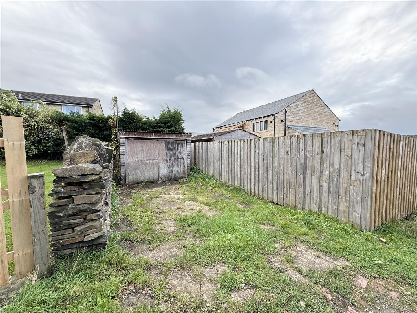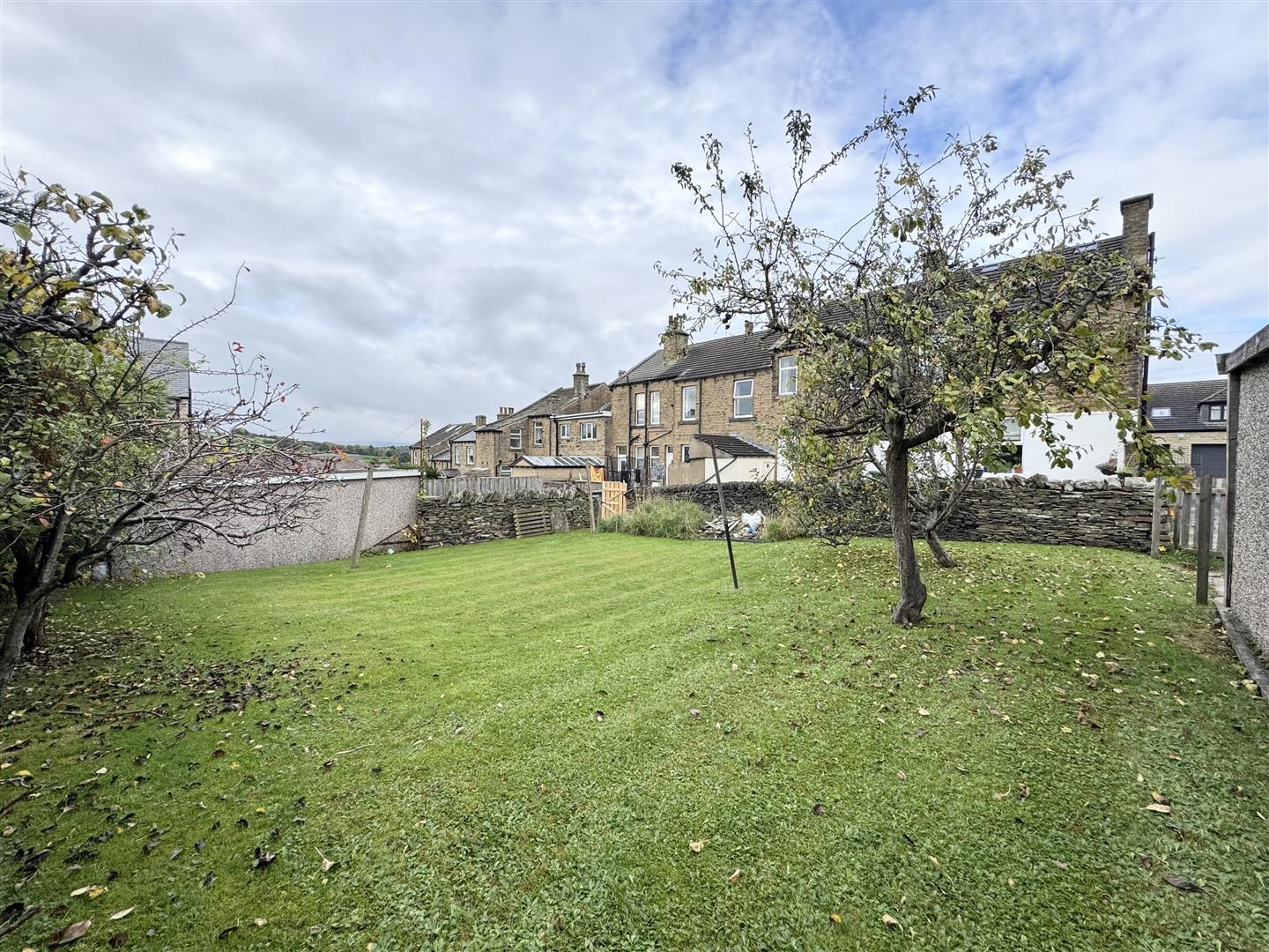 Across the access lane sits an unusually generous enclosed lawned garden with well established fruit trees.