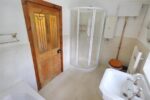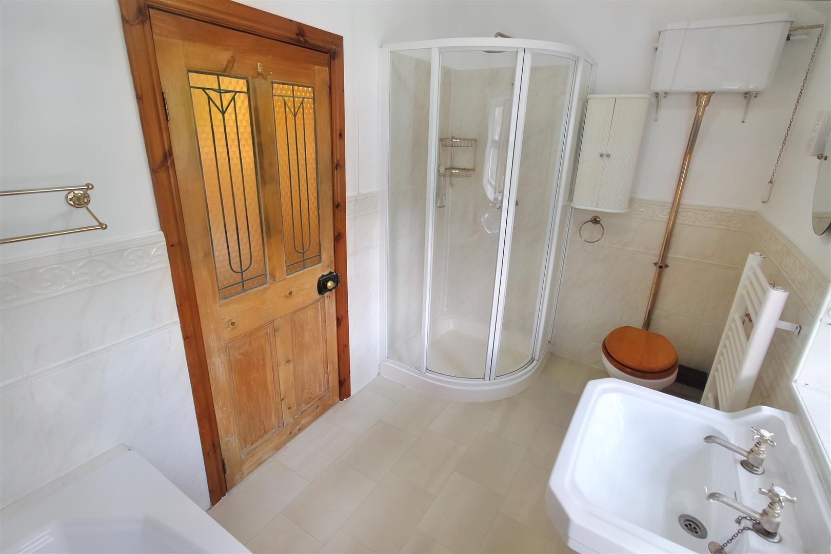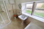 This contemporary house bathroom is fitted with a four piece suite including a corner shower cubicle, bath with handheld shower attachment, high level W.C and pedestal hand wash basin. There are two rear facing obscure glazed windows which fill the room with light, the walls are partially tiled with white wall tiles and vinyl flooring completes the room. A door leads to the landing.