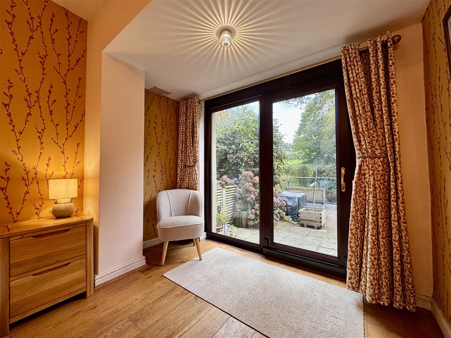 A second very generous double bedroom or potential reception space positioned to the side of the property with ample space for freestanding furniture, double glazed windows with views of garden, village green beyond and rear door with steps leading down to the garden space.