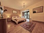 A superb and extremely spacious double bedroom positioned to the rear of the property with direct access to the side garden through sliding patio doors. The room is neutrally decorated with attractive fitted wood flooring underfoot, fitted wardrobes with further space for freestanding furniture and door giving access to the en suite shower room.
