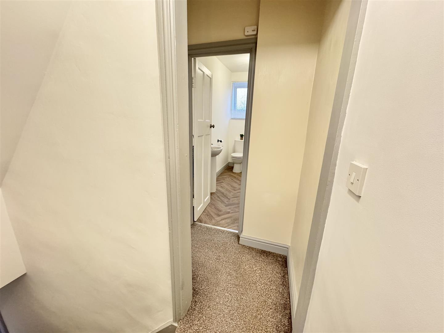 Stairs ascend from the inner lobby to the first floor landing having carpet flooring, pendant ceiling lighting and a power socket. Internal doors lead to the bathroom and both bedrooms.