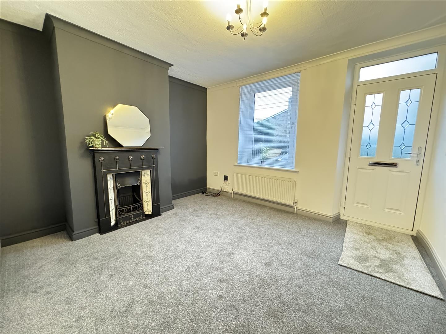 You enter the property through a composite front door into this good size living room, situated at the front of the property with the double glazed windows bathing the room with natural light. The focal point of the room is the Victorian style open fireplace, there is carpet flooring, a wall mounted radiator, ceiling multi bulb lighting and coving to the ceiling. A door leads to the inner lobby.