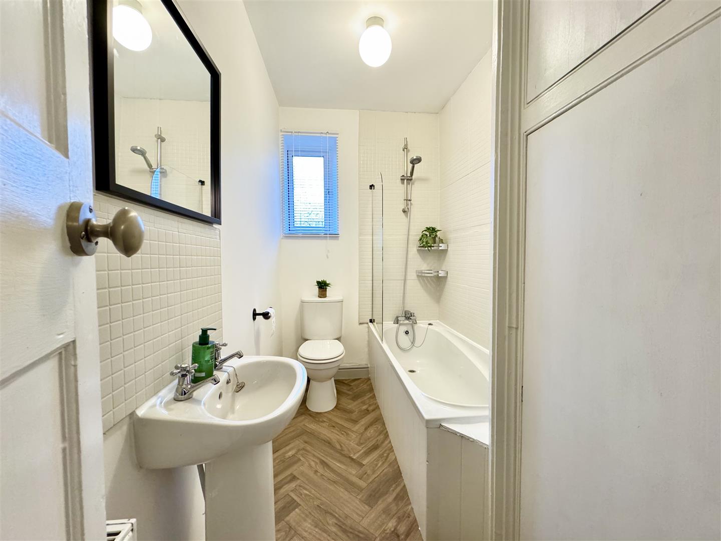 Modern house bathroom having a three piece suite in white consisting of a panel bath with mixer tap, shower attachment and glass shower screen, pedestal wash basin and twin flush low level WC. There is tiling on the walls to splash areas and around the shower, vinyl flooring, a wall mounted radiator and ceiling light. A useful cupboard houses the boiler and ideal for drying and airing and an internal door leads to the landing.