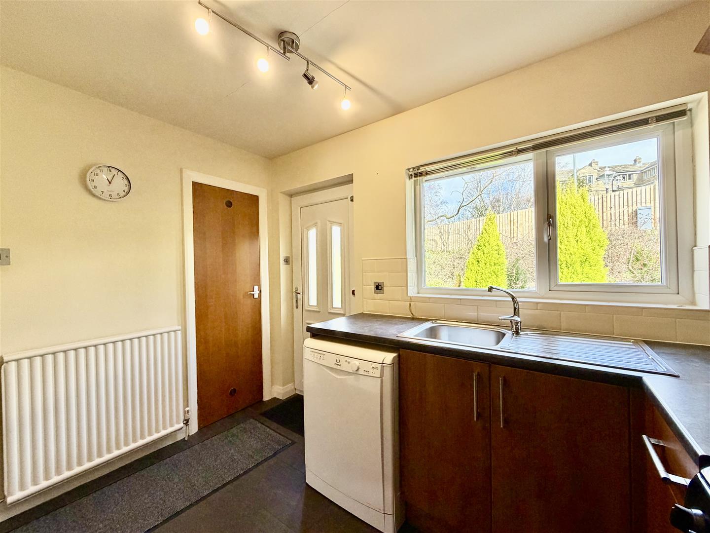 To the rear can be found a generous garden area including lawn and paved patios, as well as hedged and fenced boundaries with established trees affording a good degree of privacy and views across the valley. There are steps leading to the rear entrance, access to a useful coal store and door to basement.