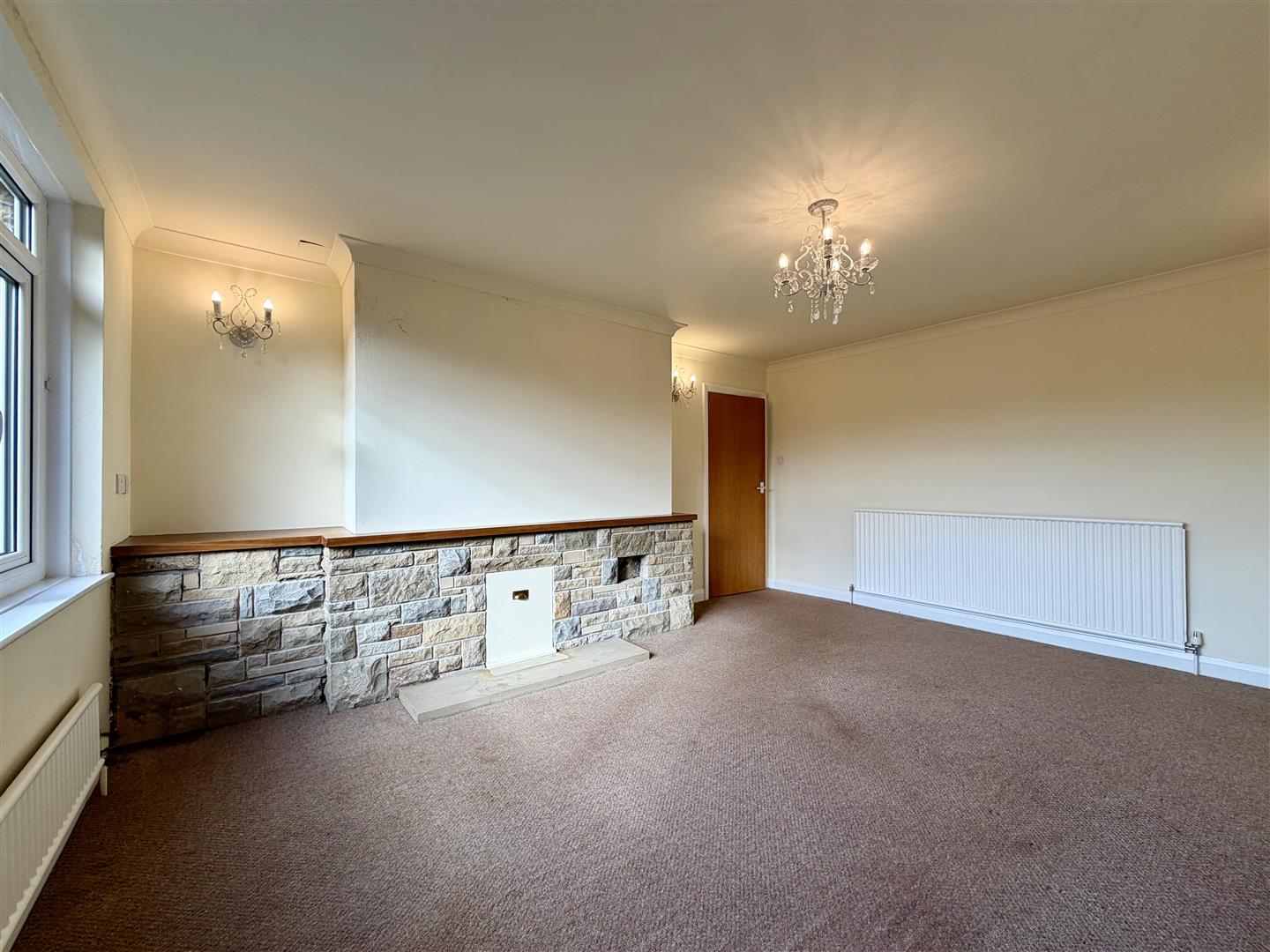 A bright and spacious living room positioned to the rear of the property having ample space for freestanding furniture, feature random stone fireplace with stone hearth and large double glazed picture window to the rear elevation affording far reaching views towards the valley.