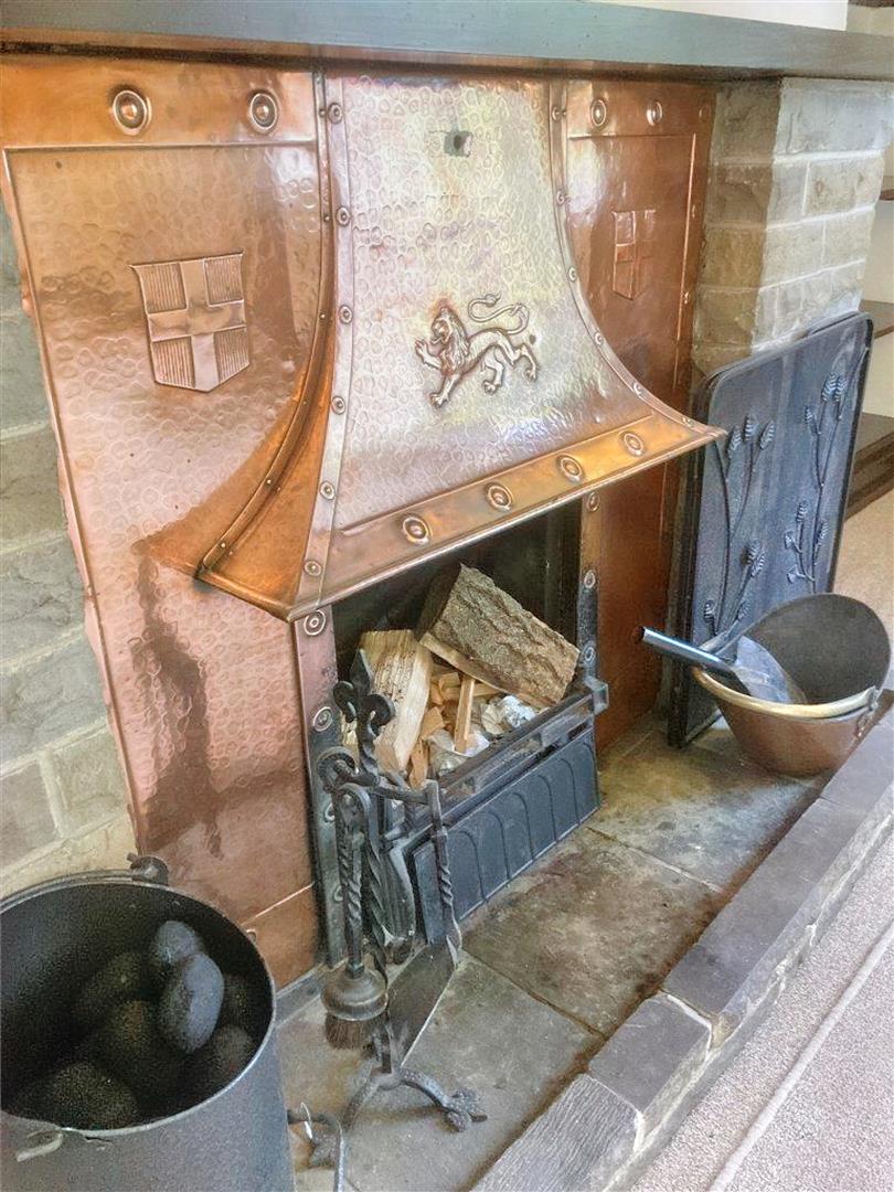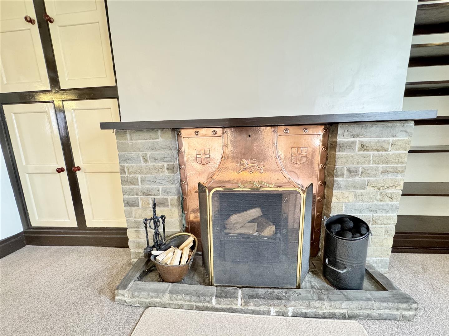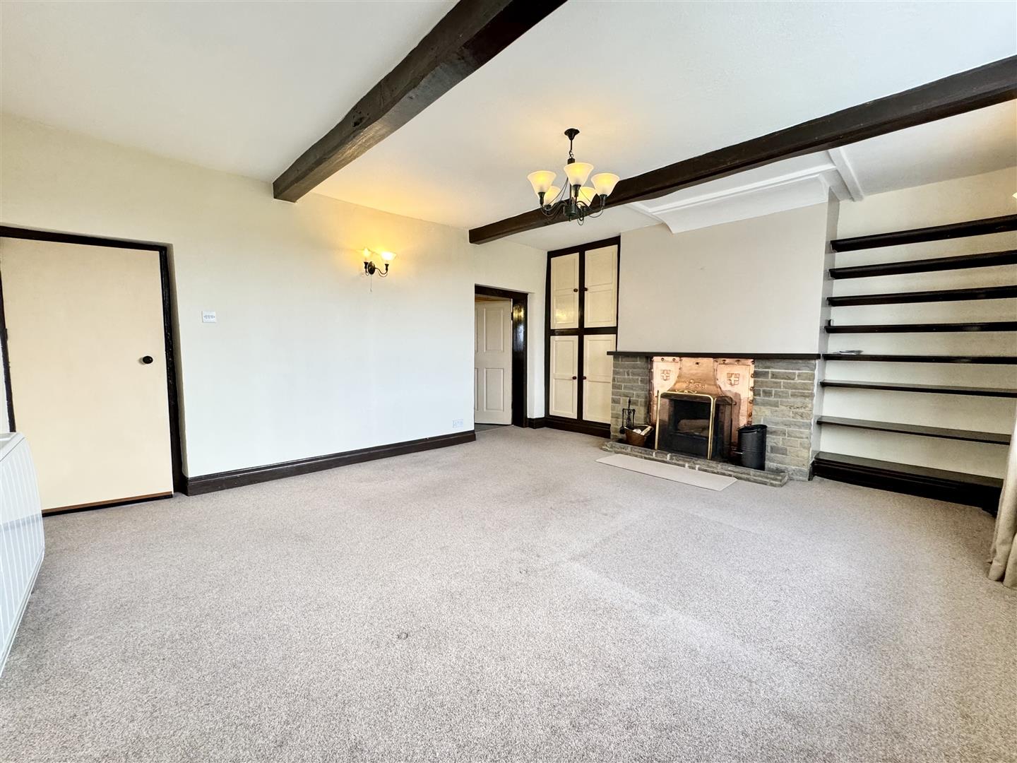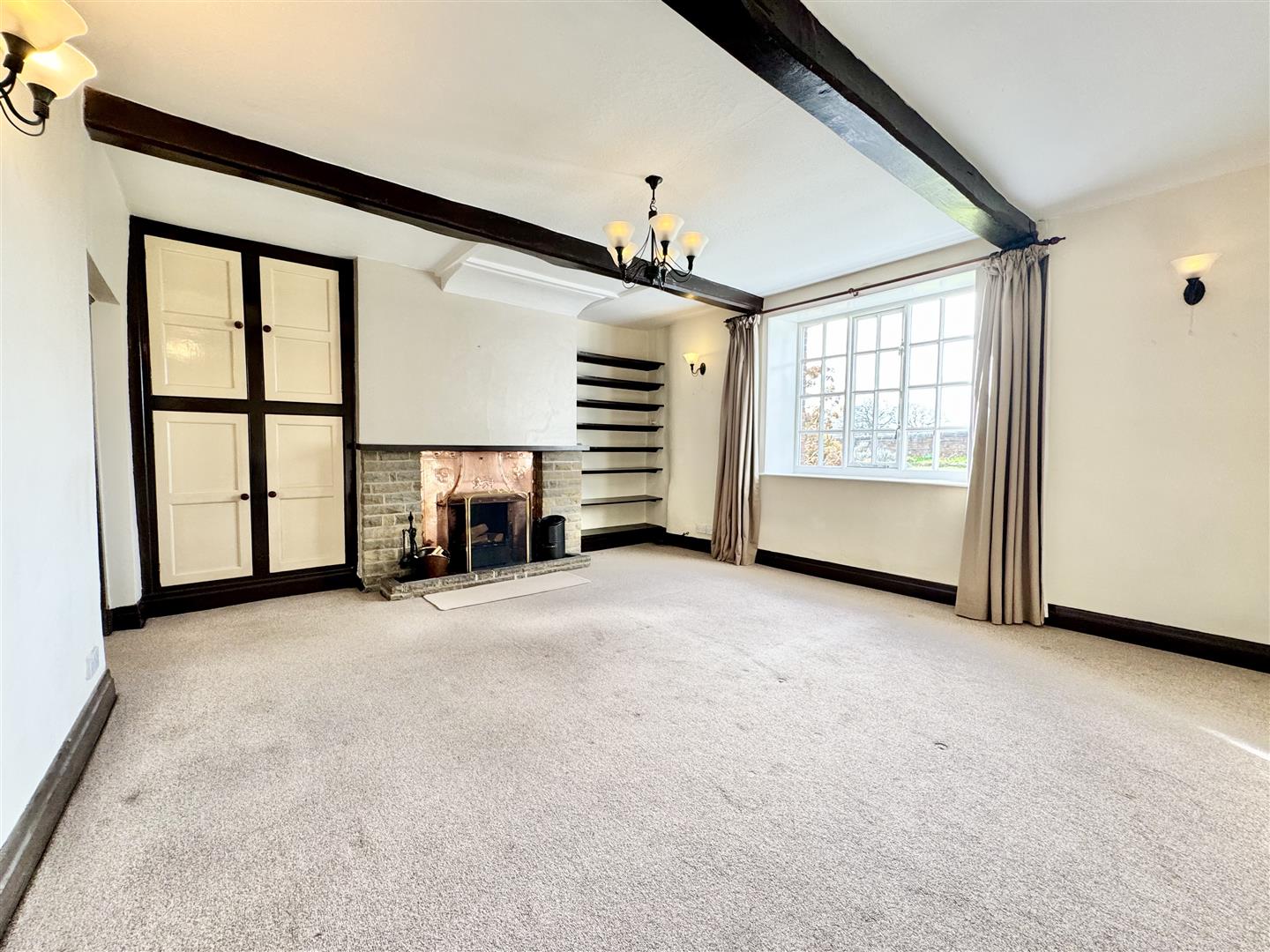 This generous sized room has maintained plenty of character through the timber beams and central stone faced fireplace with an open fireplace with an antique copper canopy above. There is ample room for freestanding living room furniture and a large south facing window overlooks the front garden. The room is finished in neutral tones with built-in storage to one alcove, and shelving to the other, carpeted flooring, ceiling and wall lighting and a door leads to the rear hall and through to the kitchen.