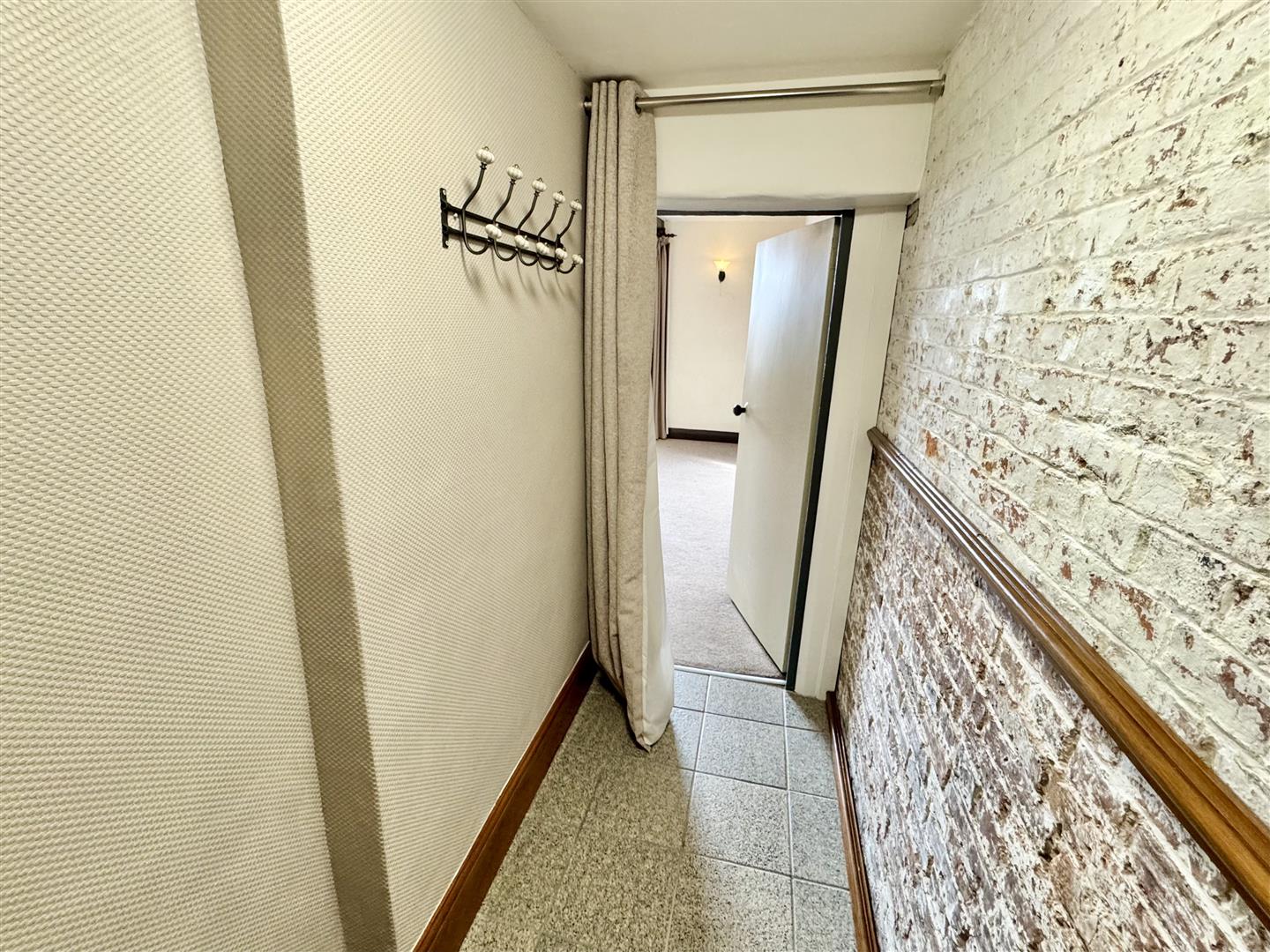 You enter the property through a timber door into the entrance hallway where there is coat storage, exposed brick wall, tiled flooring and a door leads to the lounge.