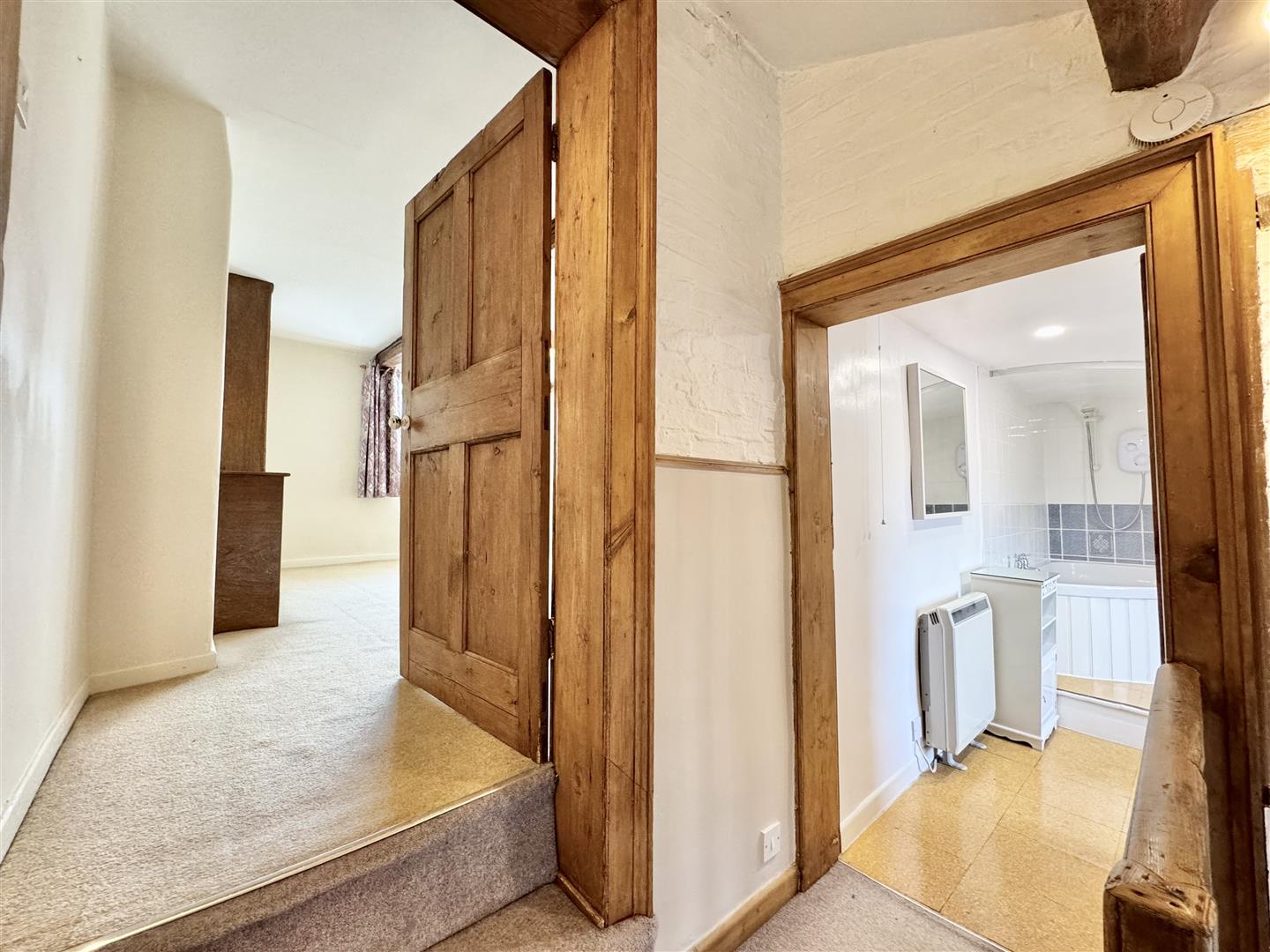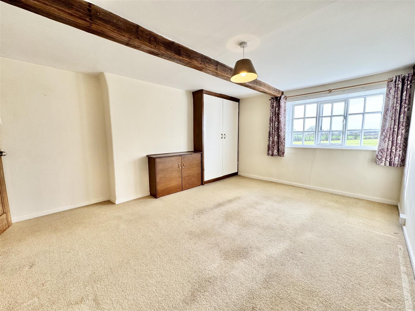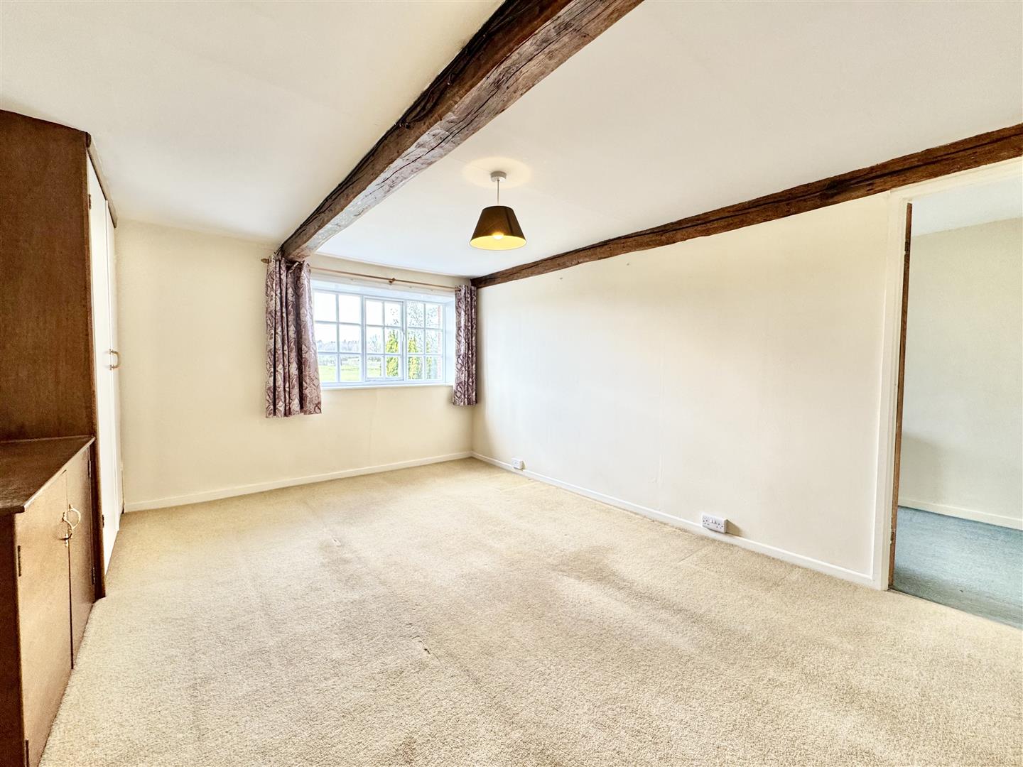 This versatile room again situated at the front, could easily be used as a study, bedroom or dressing room. There is carpeted flooring, exposed beams, neutral decor and a door leads to the main bedroom